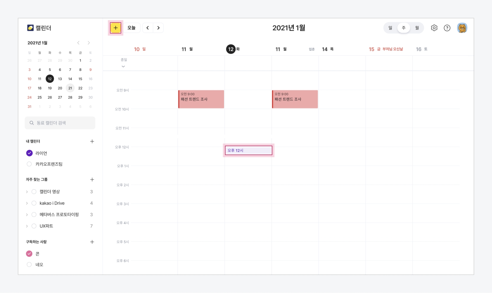 [+] 아이콘을 클릭하거나 캘린더에서 일정을 생성할 날짜/시간을 선택합니다.