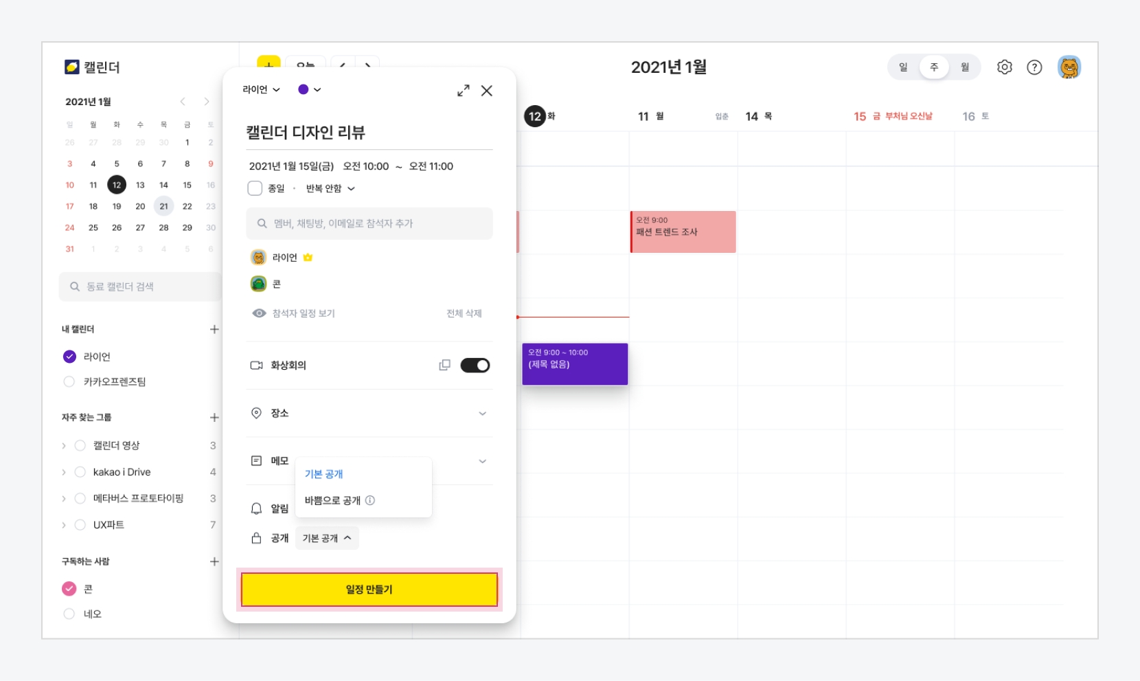 참석자 일정 숨기기 상태(PC) 화상회의와 장소, 메모 등 세부적인 내용을 추가한 뒤 [일정 만들기] 버튼을 클릭합니다.