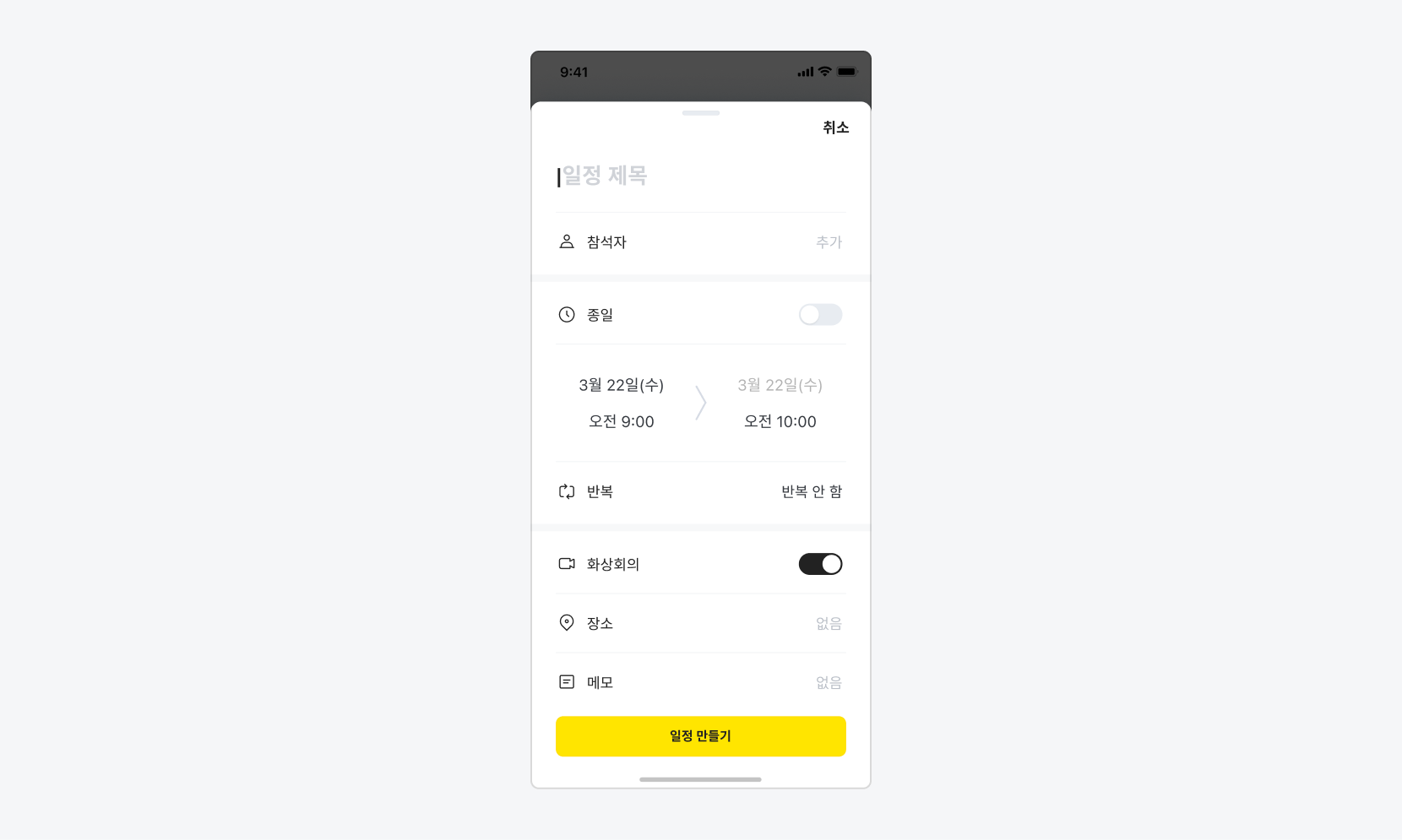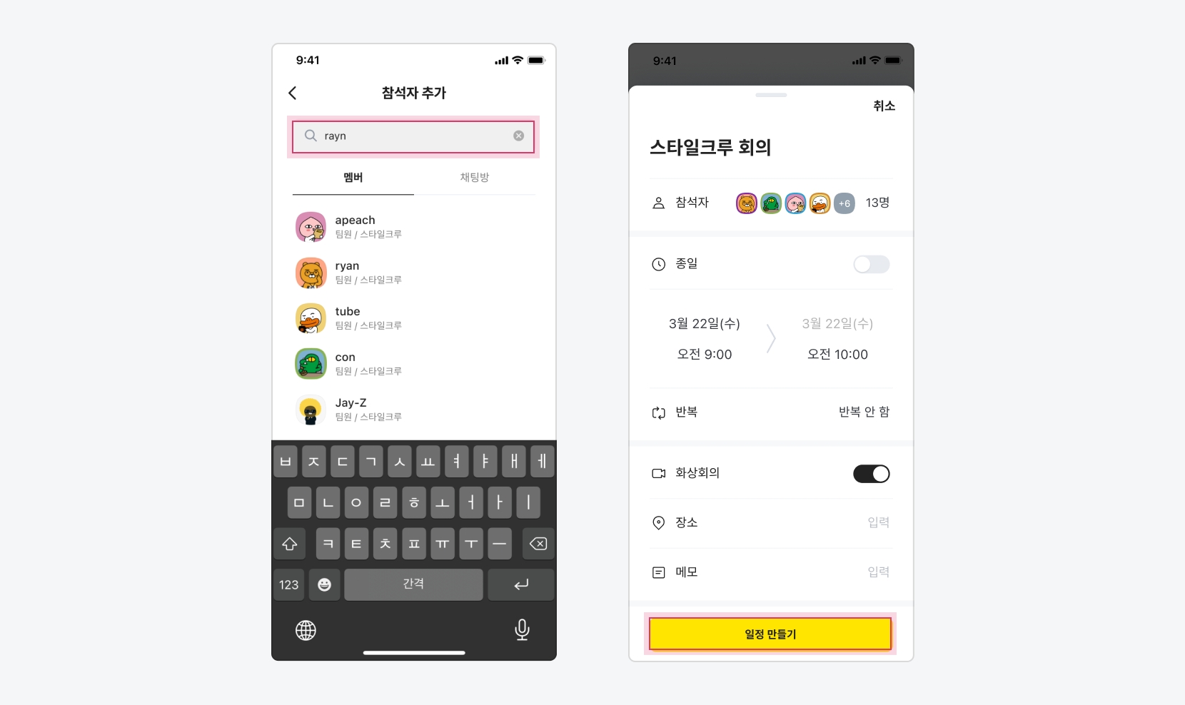 일정 정보 입력(Mobile) 참석할 멤버를 추가하고, 화상회의와 메모 등 세부적인 내용을 추가한 뒤 [일정 만들기] 버튼을 선택합니다.