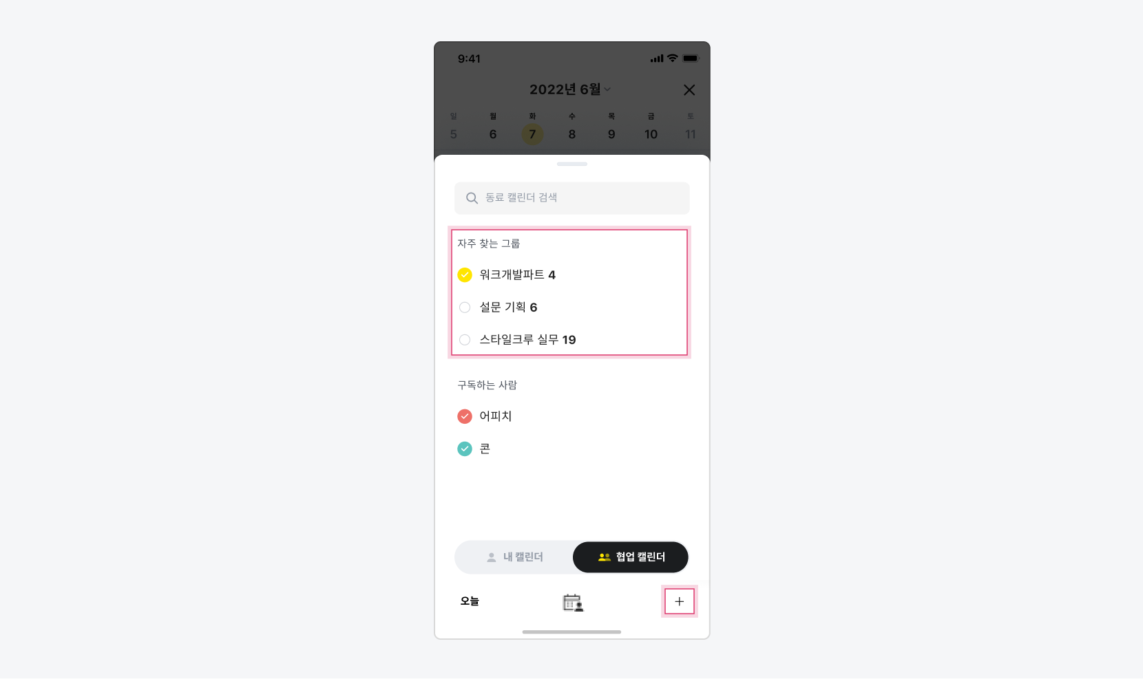 협업 캘린더 모드 선택(Mobile) 자주 찾는 그룹 중 함께하는 일정을 만들고 싶은 그룹에 체크하고,