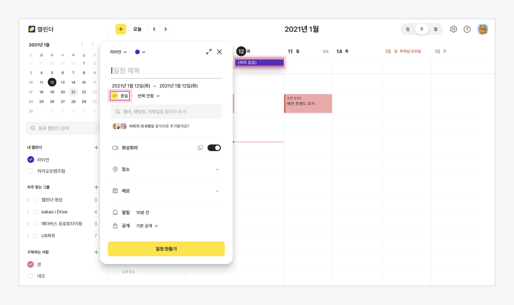 반복 일정 생성(PC) 생성된 일정 제목을 입력하고, 일정에 초대할 멤버를 추가합니다.