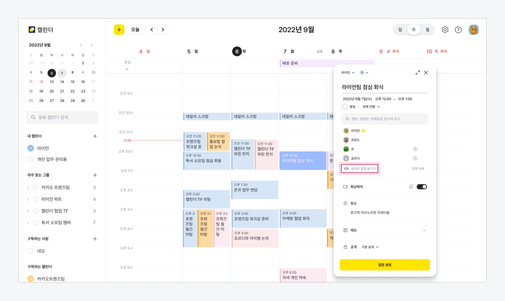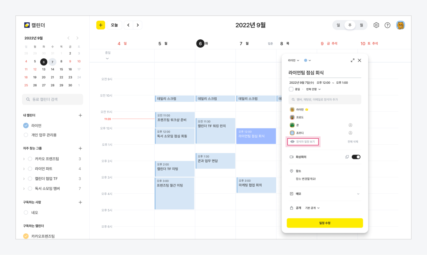 일정 생성 혹은 수정 시, 참석자들의 일정 블록을 보거나 숨길 수 있습니다. 참석자 일정 보기를 활용하면 참석자들의 일정 블록을 한 번에 조회해 빈 시간을 빠르게 찾을 수 있고, 참석자들의 일정 블록을 숨긴 채 기존 일정에서 제목이나 메모 등의 내용을 빠르게 수정할 수 있습니다.