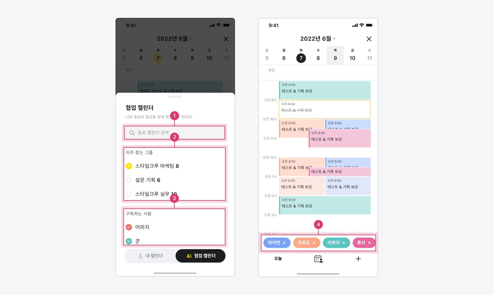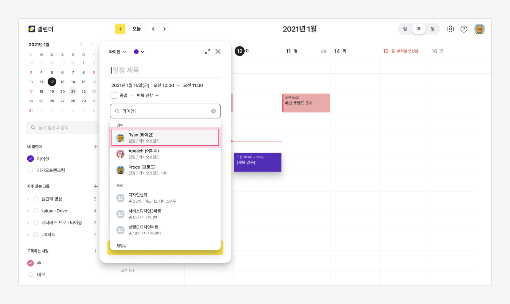 검색 및 자주 찾는 그룹, 구독하는 사람 메뉴에서 선택한 동료 - 멤버 선택 시, 동료의 일정 함께 확인 가능