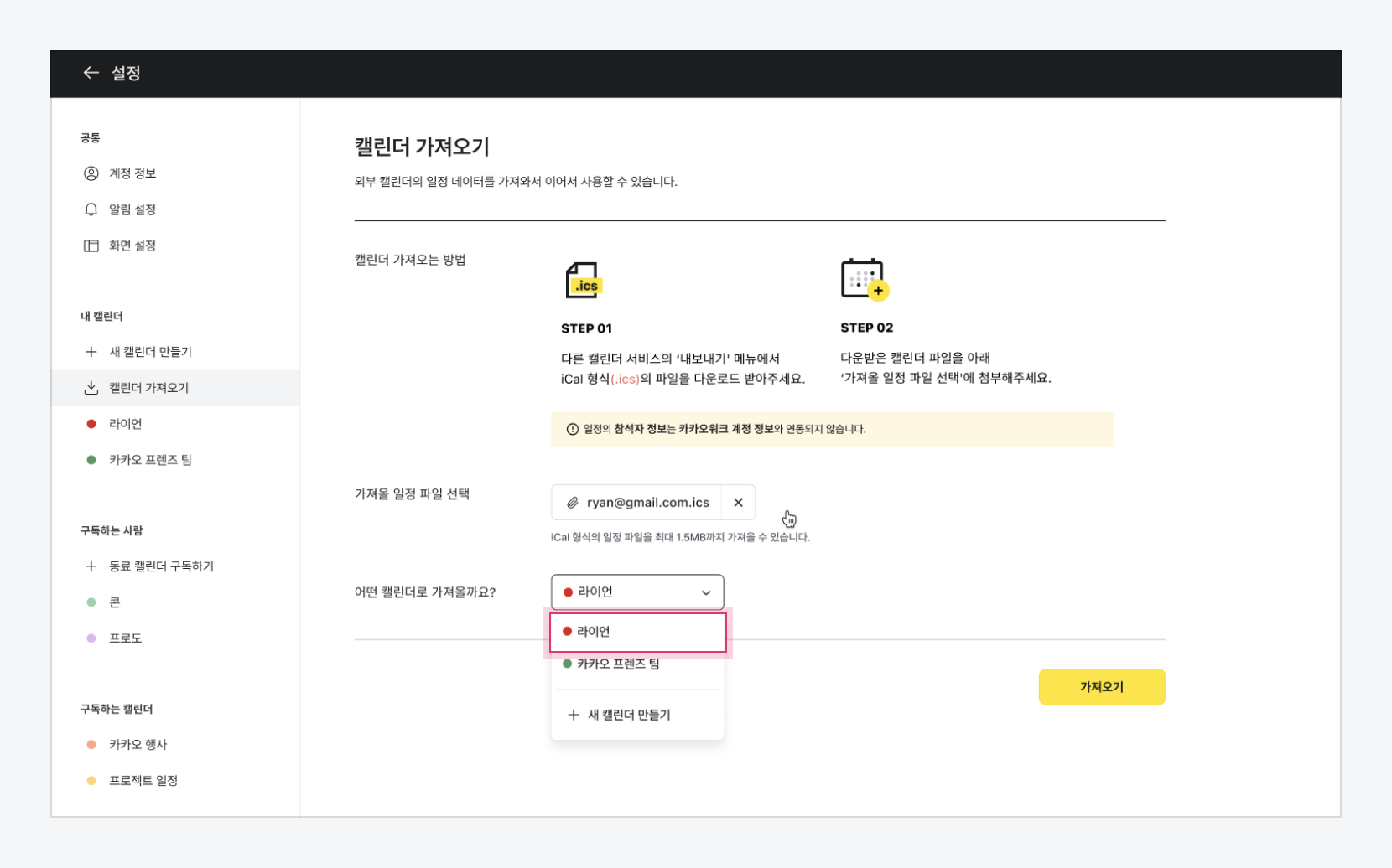 일정 파일 업로드(PC) 일정을 가져올 캘린더를 선택 또는 생성합니다.