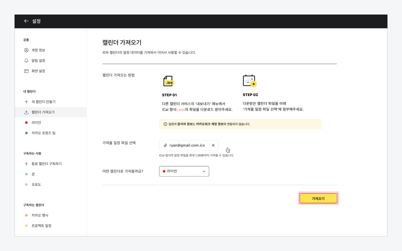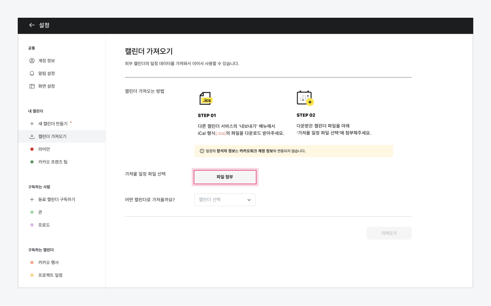 캘린더 설정(PC) 내 캘린더 > 캘린더 가져오기 메뉴에서 [파일 첨부] 버튼을 클릭하여 파일을 업로드합니다.