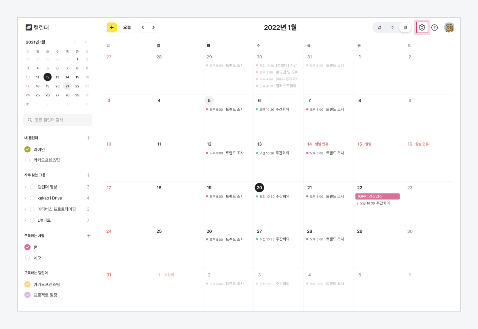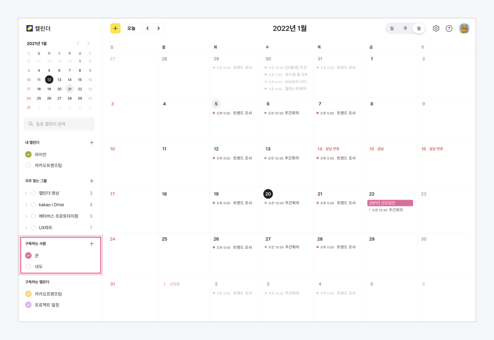 캘린더 구독(PC) 구독한 멤버의 캘린더는 홈 화면의 구독하는 사람 영역에 추가됩니다.