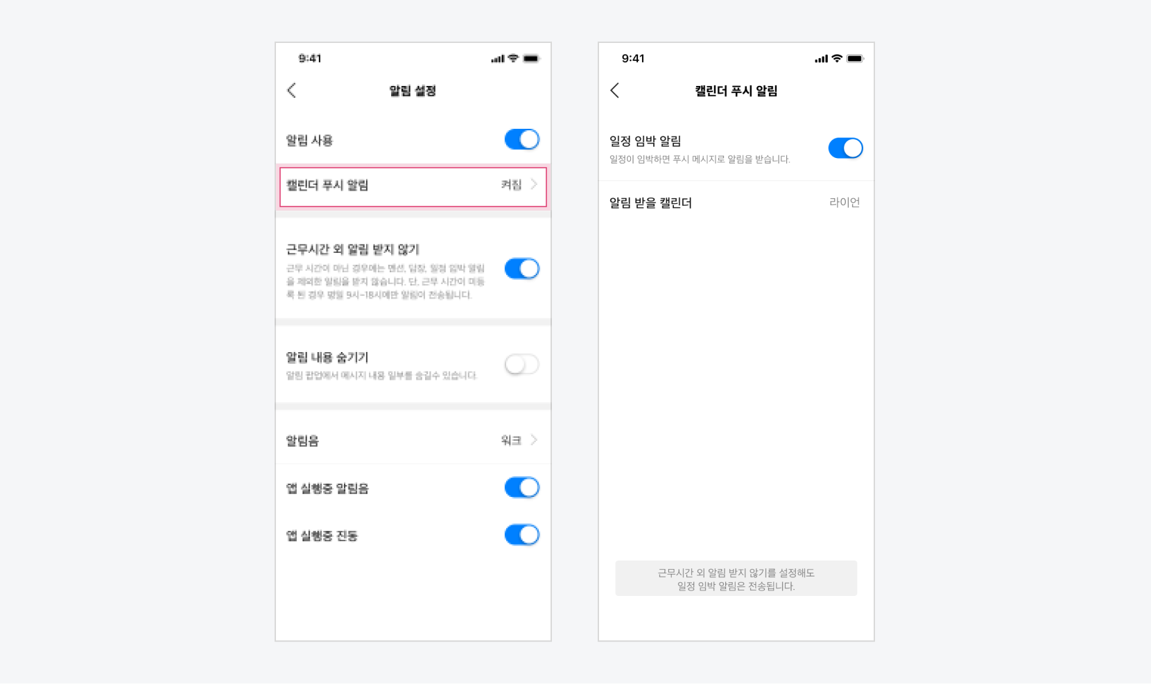 안내 근무시간 외 알림 받지 않기 설정을 활성화한 상태에서도 일정 임박 알림은 발송됩니다.
