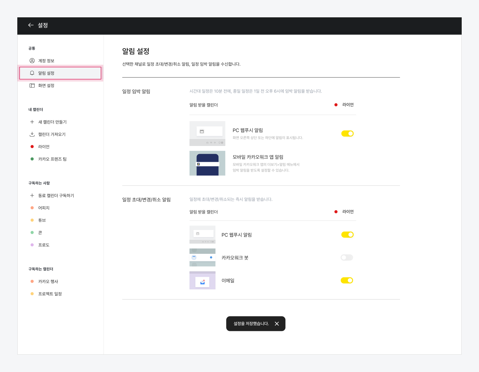 안내 PC 웹푸시 알림은 카카오워크 캘린더 웹 페이지가 열려있을 때에만 작동합니다.