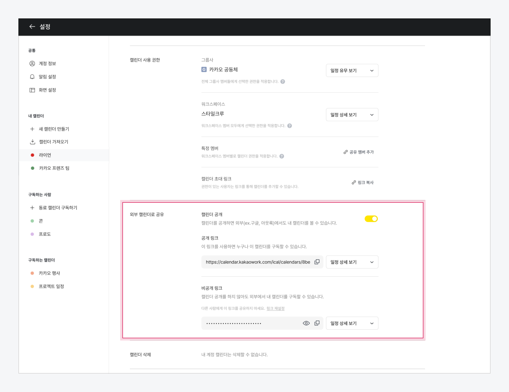 캘린더 공개 설정을 하지 않아도 외부 캘린더에서 구독할 수 있는 캘린더 공유 링크 - 캘린더 관리, 캘린더 소유자 권한을 가진 멤버에게만 노출 - 다른 사용자에게 유출되지 않도록 주의(유출 시 링크 재설정 가능)