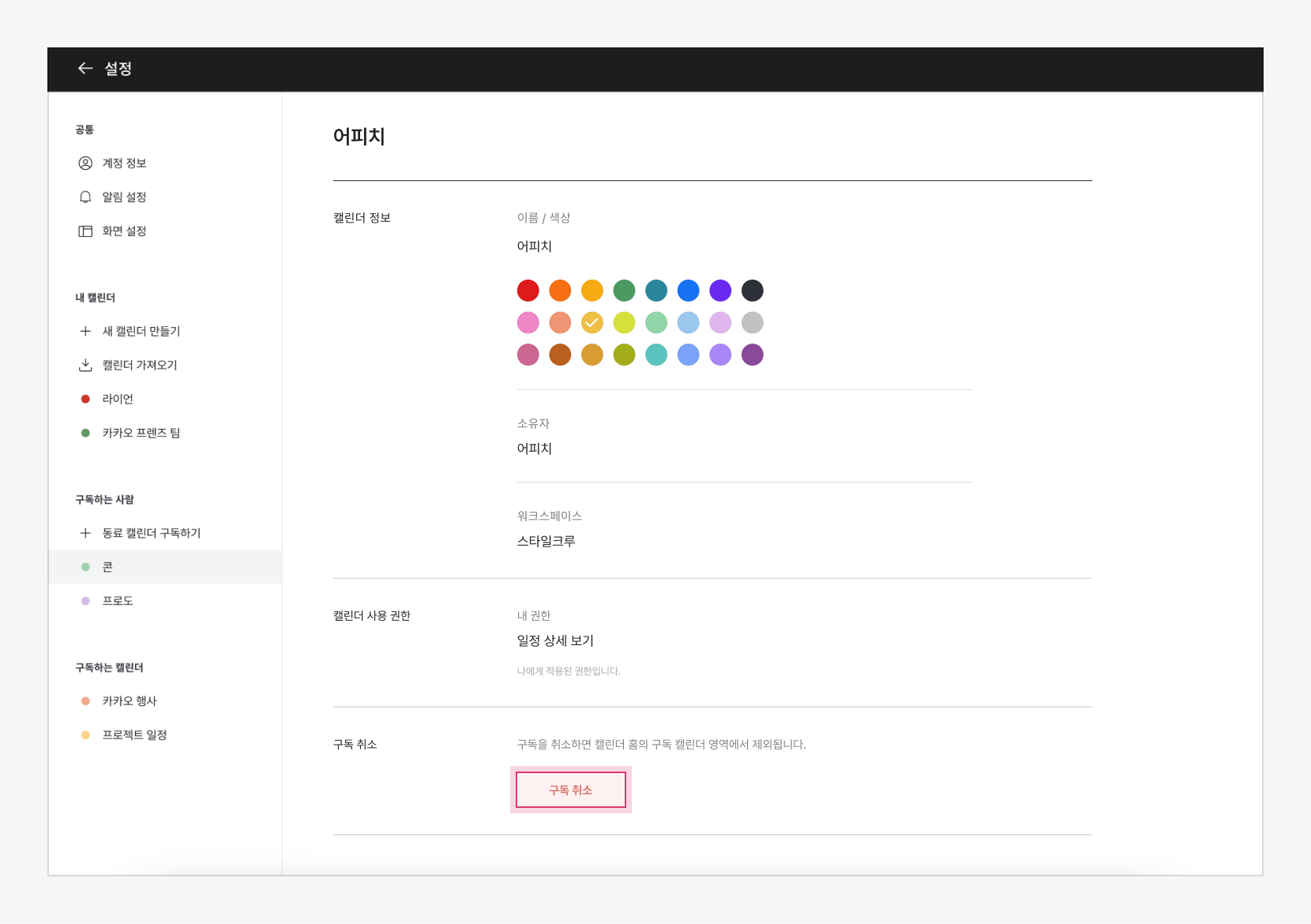 구독 취소한 캘린더는 동료 캘린더 구독하기 메뉴 또는 캘린더 관리자의 초대를 통해 언제든지 다시 구독할 수 있습니다.