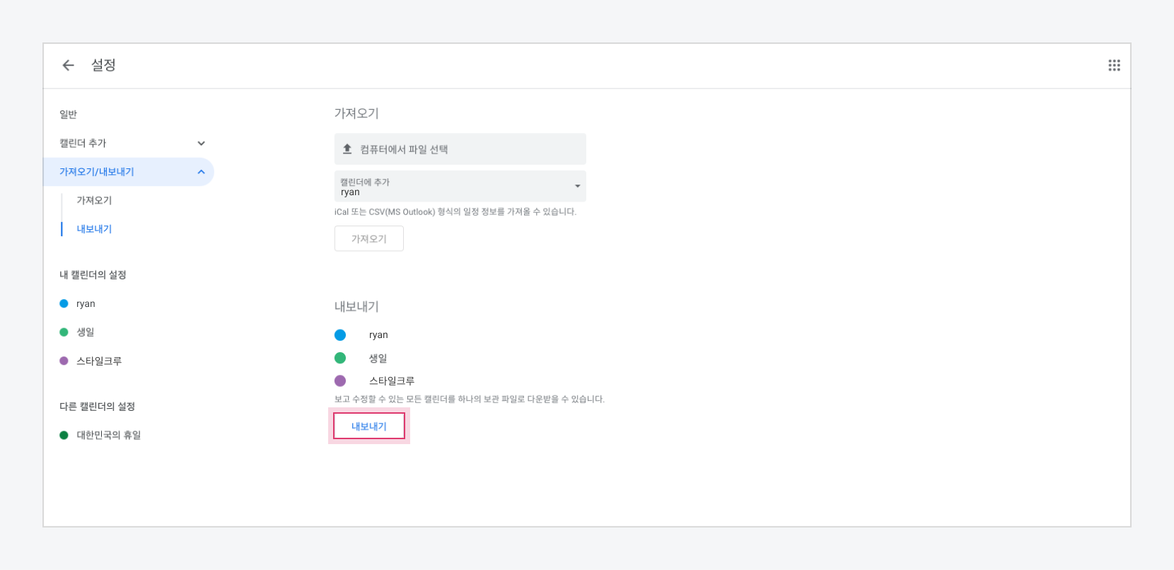 외부 캘린더 서비스의 내보내기 메뉴에서 일정 데이터를 iCal 형식(