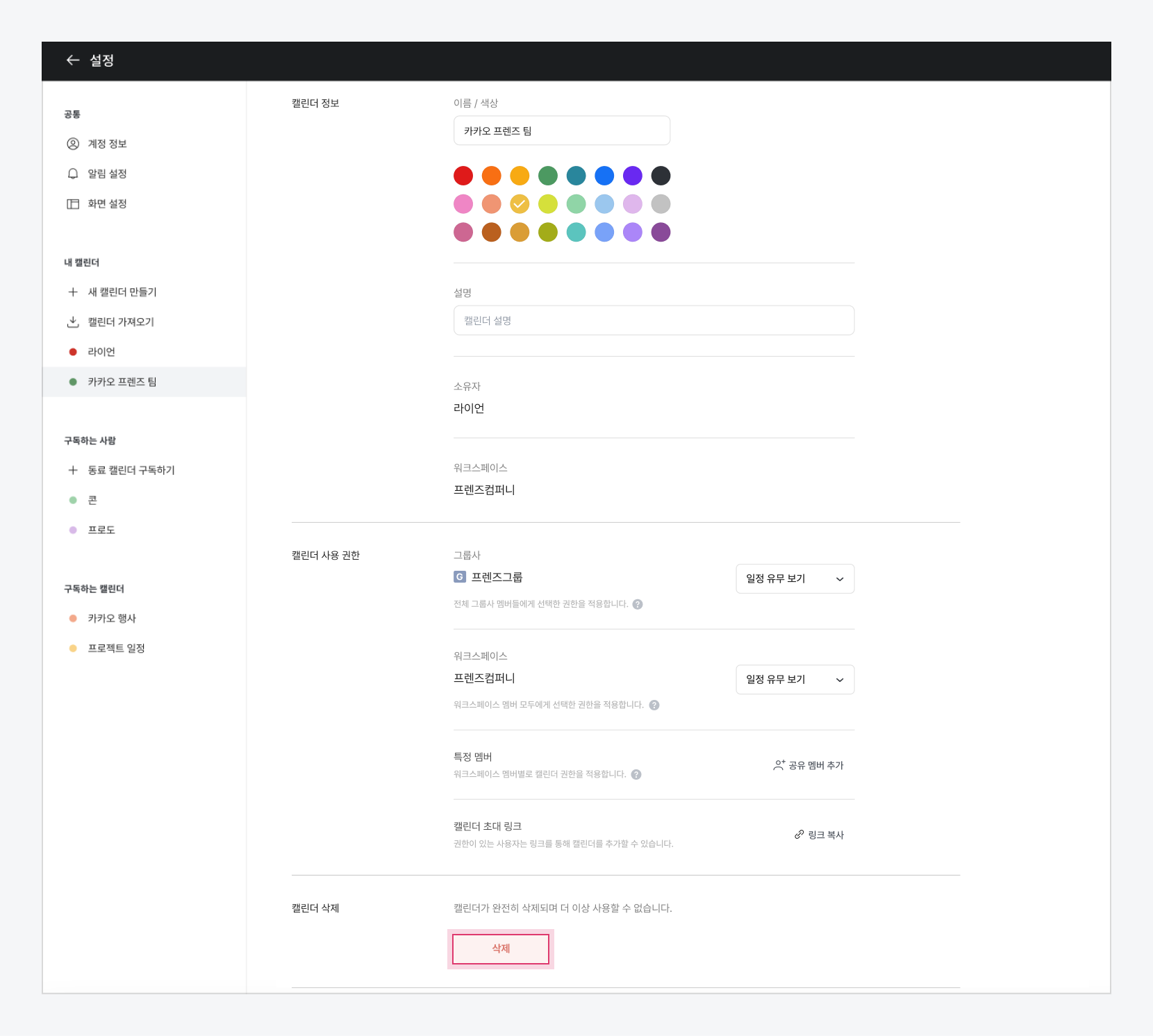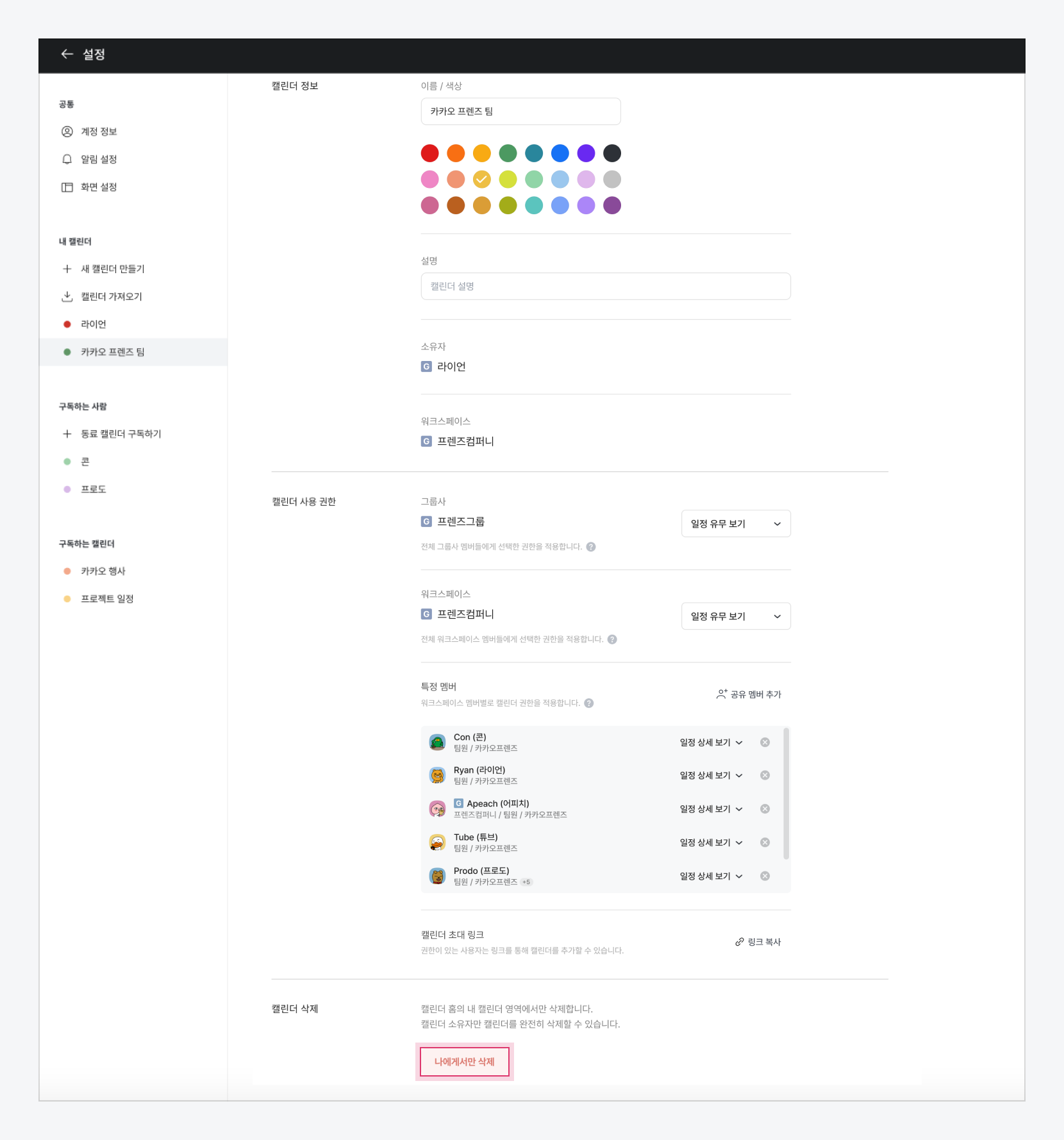 주의 캘린더를 삭제하면 캘린더와 그 안의 일정이 모두 사라지며, 캘린더를 공유한 멤버들에게도 해당 캘린더가 더 이상 노출되지 않습니다.