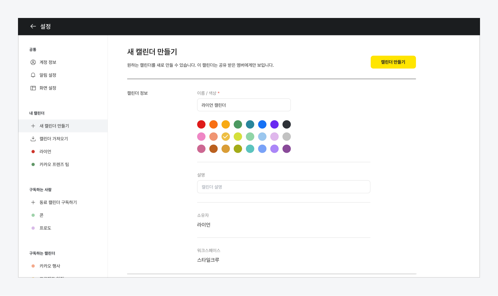 새 캘린더 만들기를 클릭하면 캘린더를 신규로 생성할 수 있습니다.