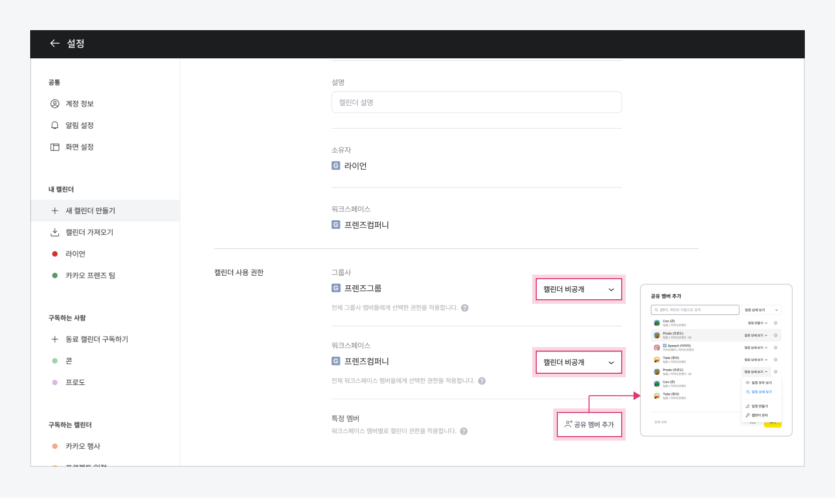 캘린더 정보 입력(PC) 그룹사, 워크스페이스, 특정 멤버를 대상으로 캘린더 공유 권한을 설정합니다.