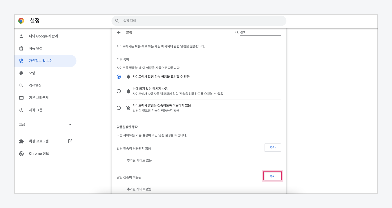알림 전송이 허용됨 항목의 [추가] 버튼을 클릭합니다.
