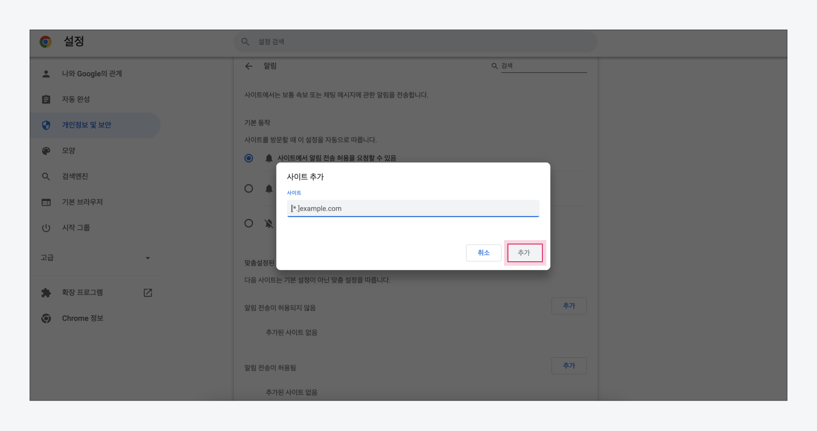 Chrome 브라우저 알림 허용(PC) 사이트 추가 팝업창에서