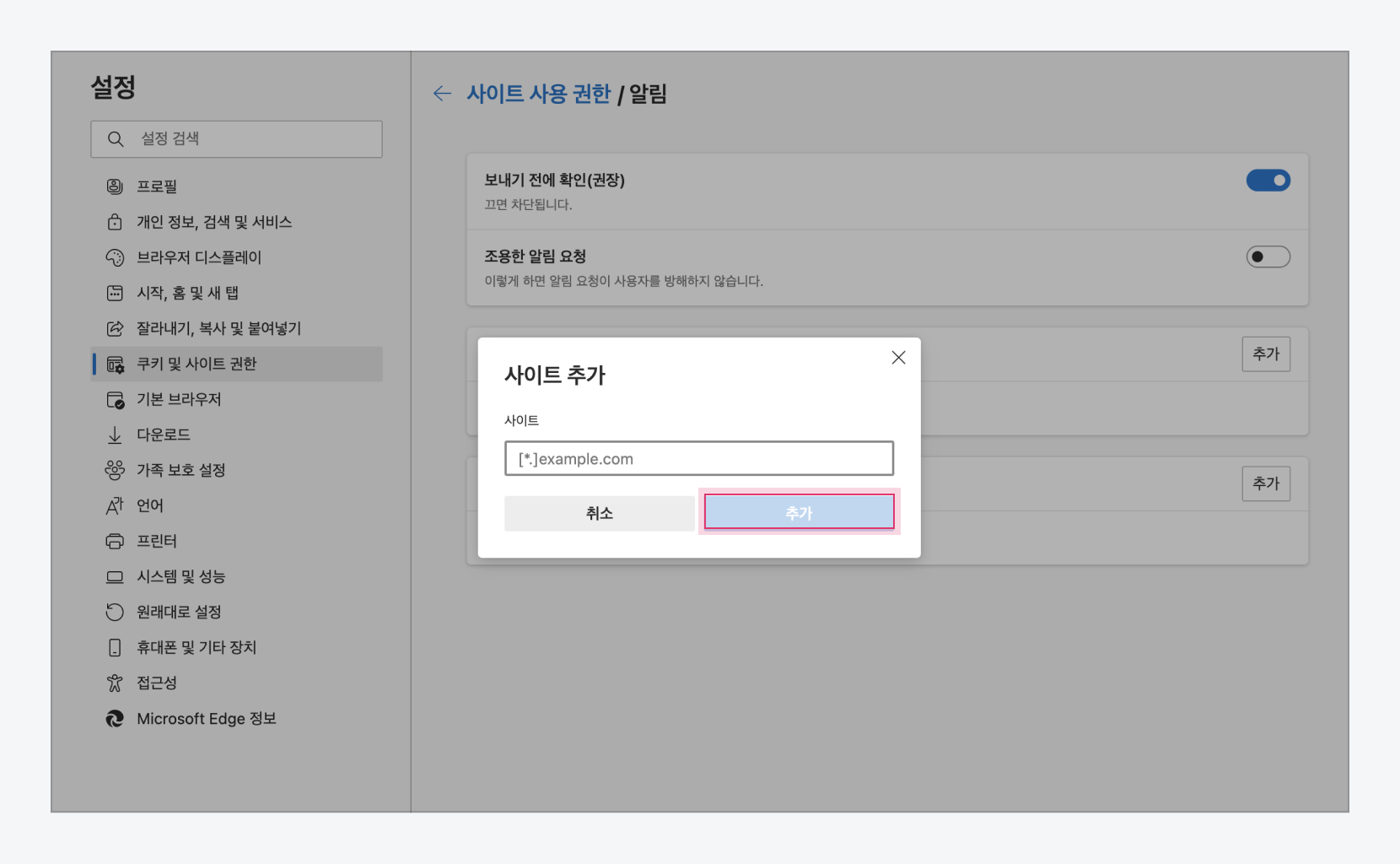 Edge 브라우저 알림 허용(PC) 사이트 추가 팝업창에서