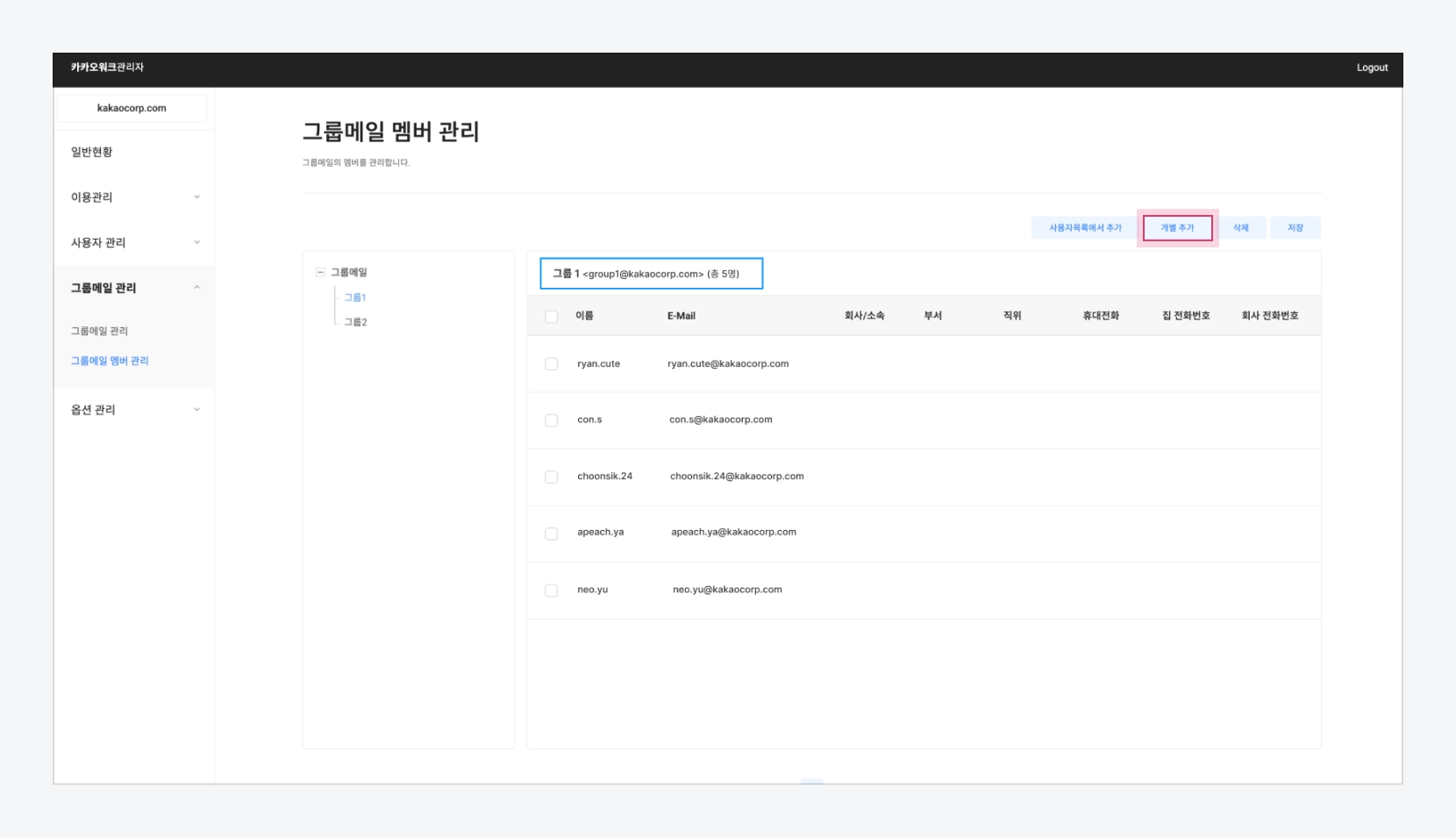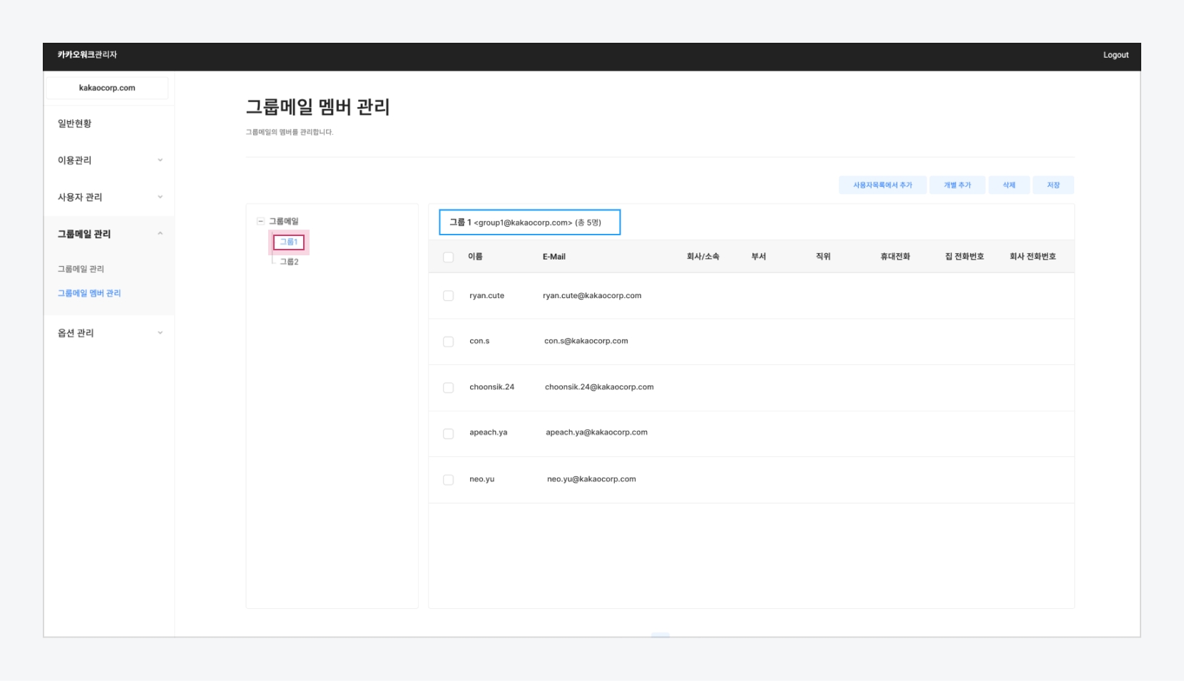 그룹메일 관리 메뉴에서 관리자로 등록된 멤버는 카카오워크 메일 > 주소록 > 그룹메일 메뉴에서 그룹메일에 속한 멤버를 관리할 수 있습니다.