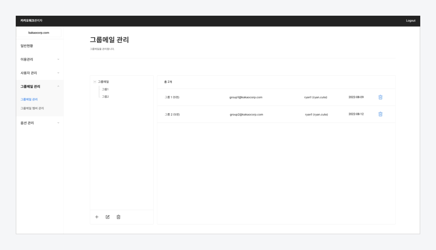 그룹메일 관리 메뉴에서 그룹메일을 생성하고 멤버를 관리할 수 있습니다. 특정 그룹메일에 대한 관리 기능을 워크스페이스 멤버에게 부여할 수 있습니다.