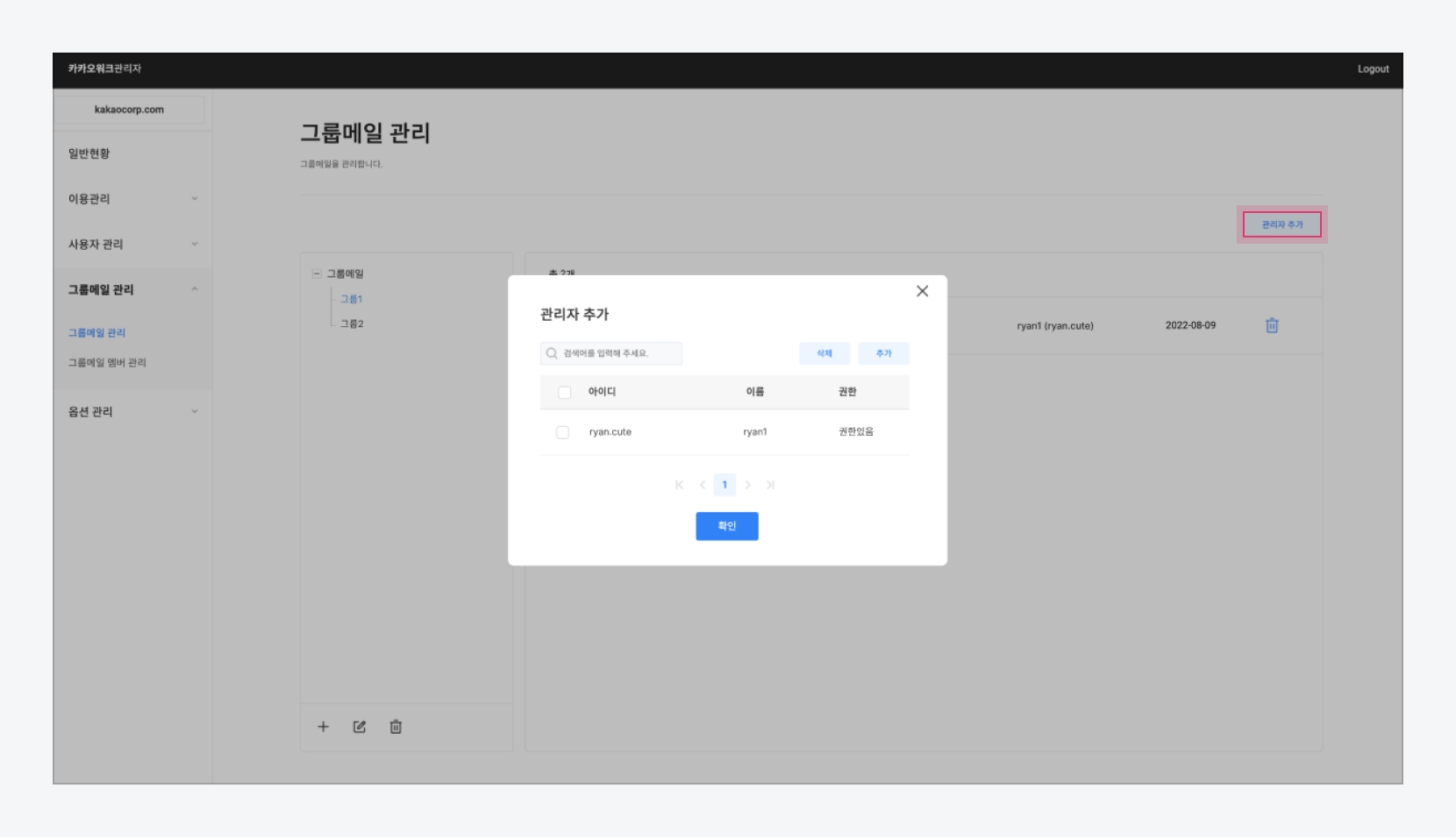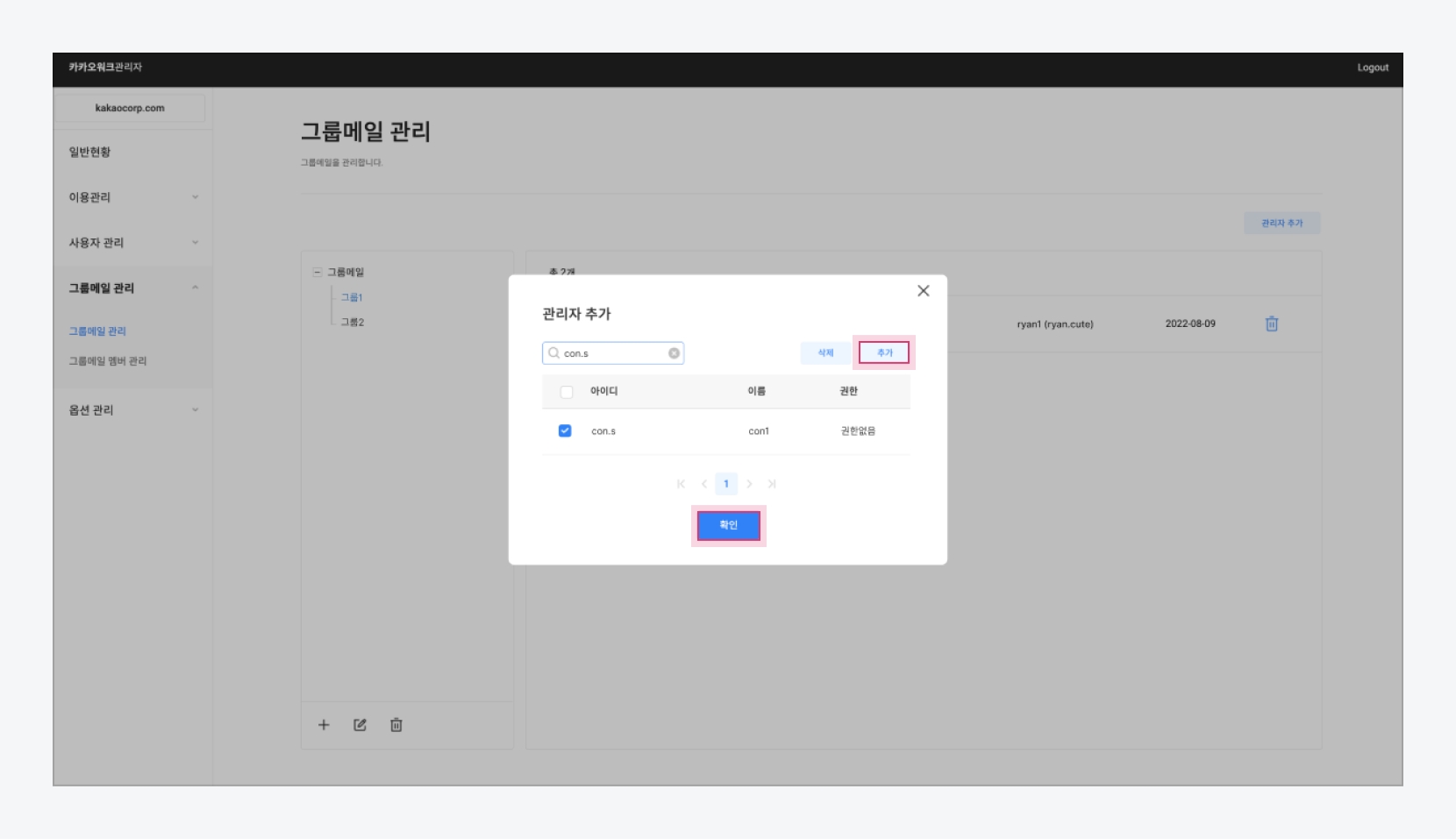 관리자 추가 관리자 추가 팝업창에서 관리자로 지정할 멤버를 검색 후 선택하고 [추가] > [확인] 버튼을 클릭합니다.