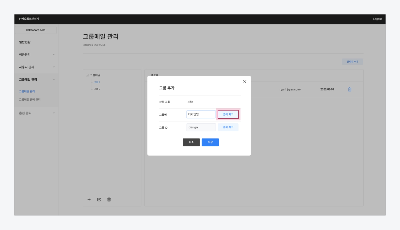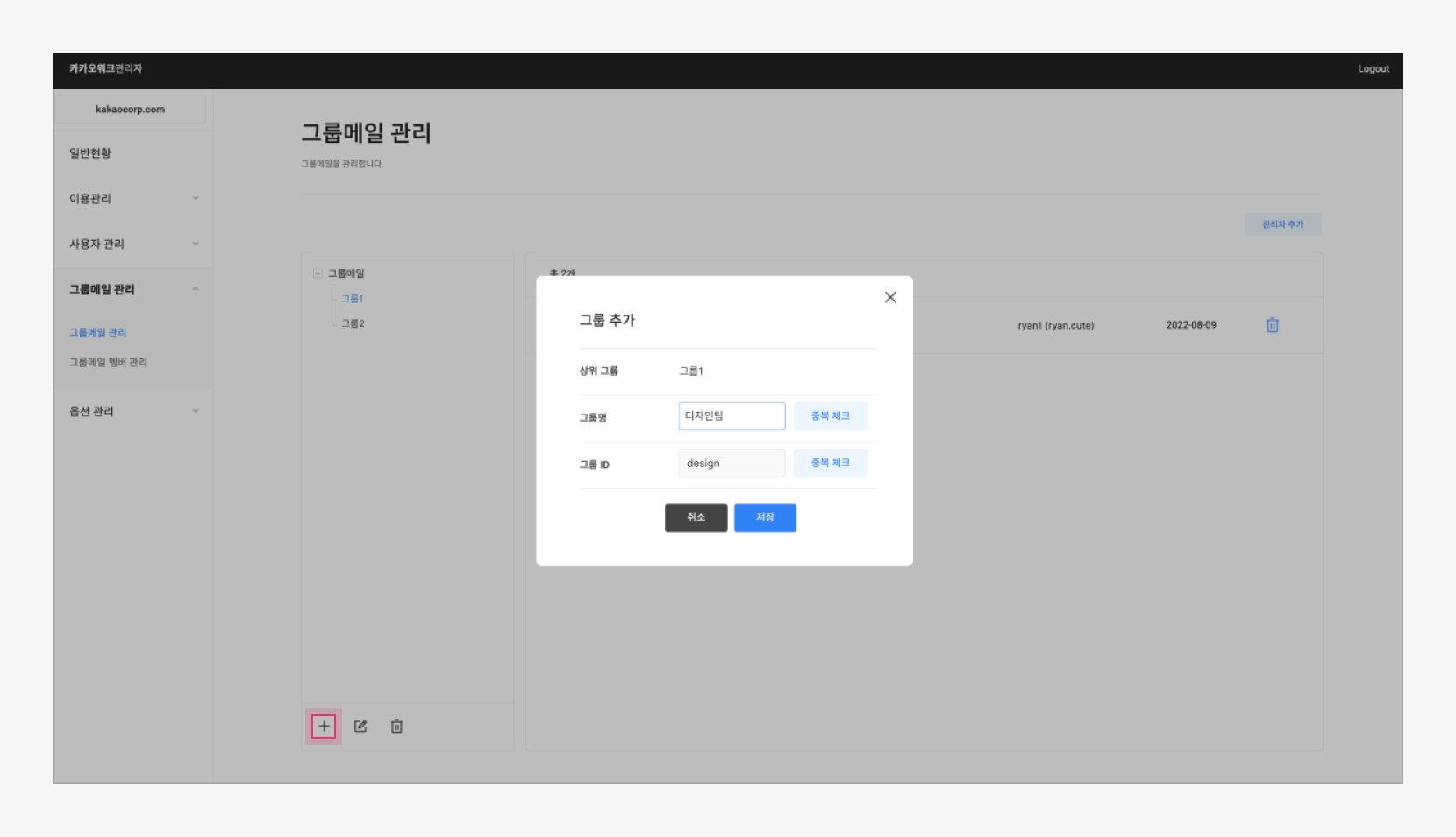 - 그룹메일 멤버 조회/편집 - 메일 주소 추가(아이디만 수정 가능)
