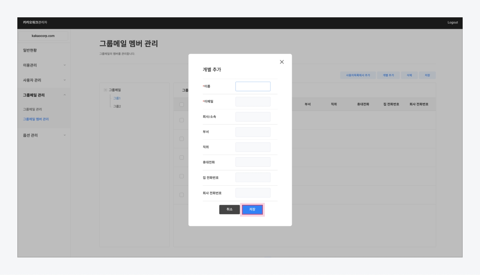 그룹메일에 포함될 멤버를 추가하는 방법은 다음과 같습니다.