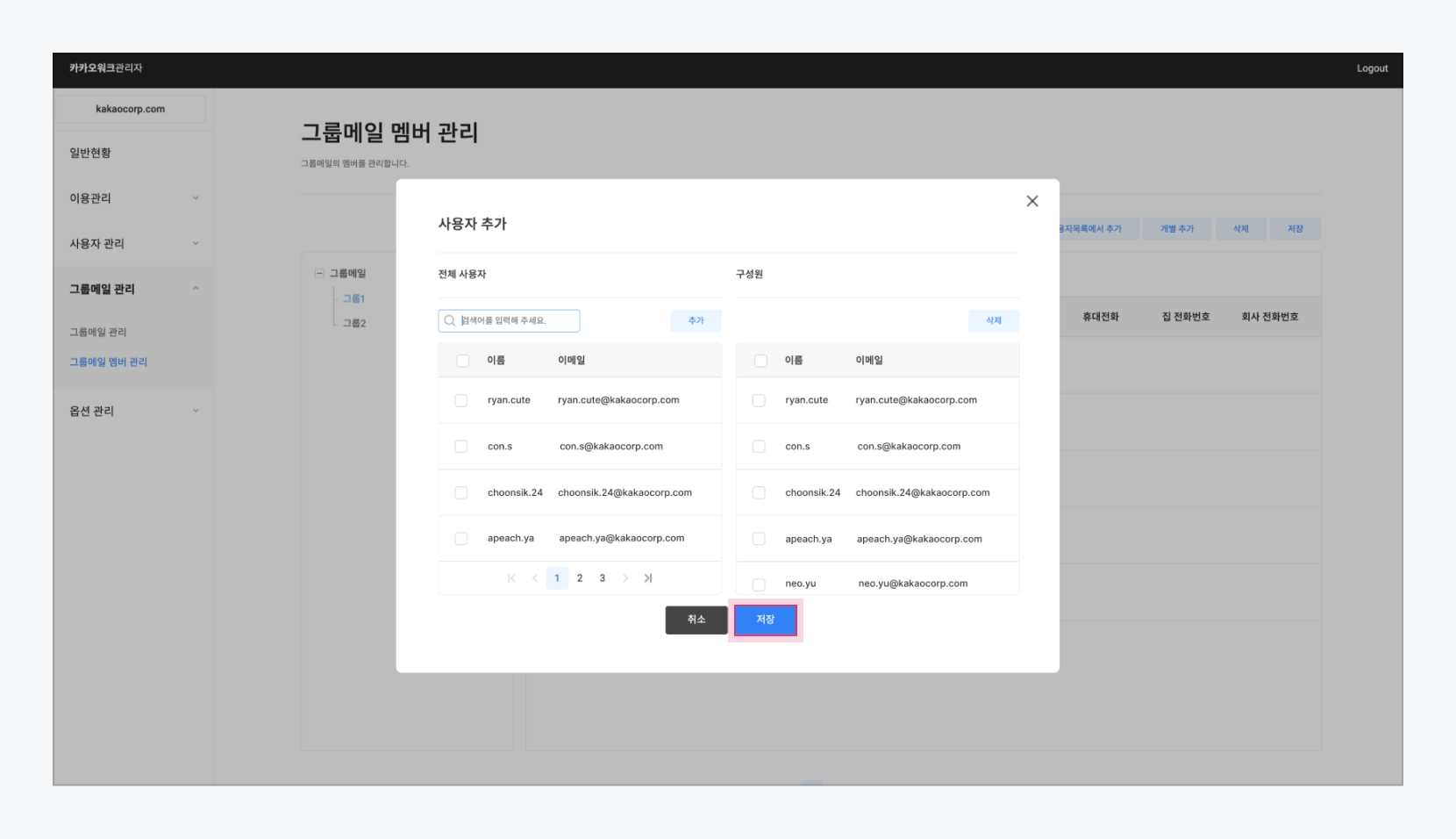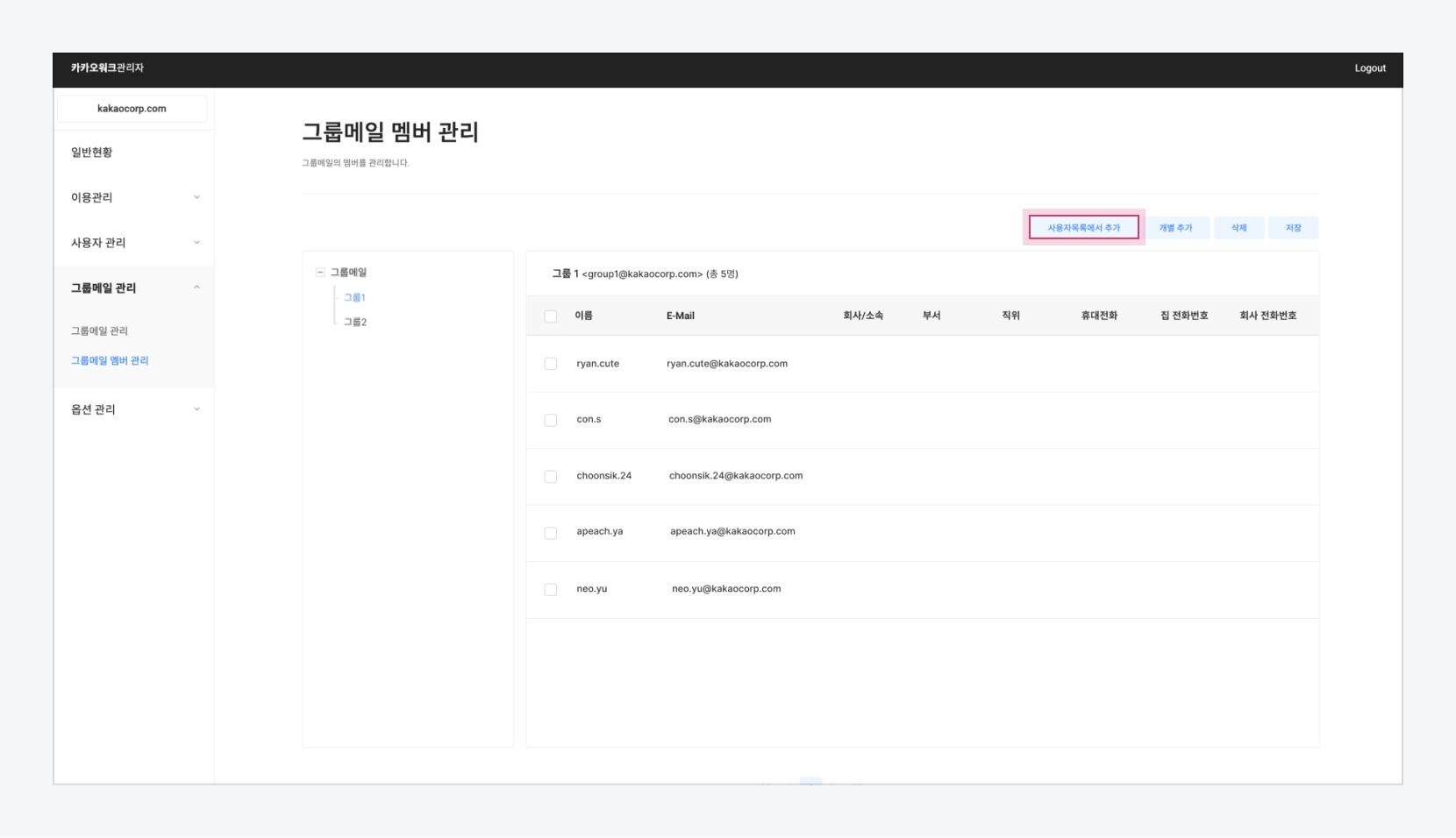 관리자로 등록된 멤버는 카카오워크 메일 > 주소록 > 그룹메일 메뉴에서 그룹메일을 사용할 멤버를 추가 또는 삭제할 수 있습니다.