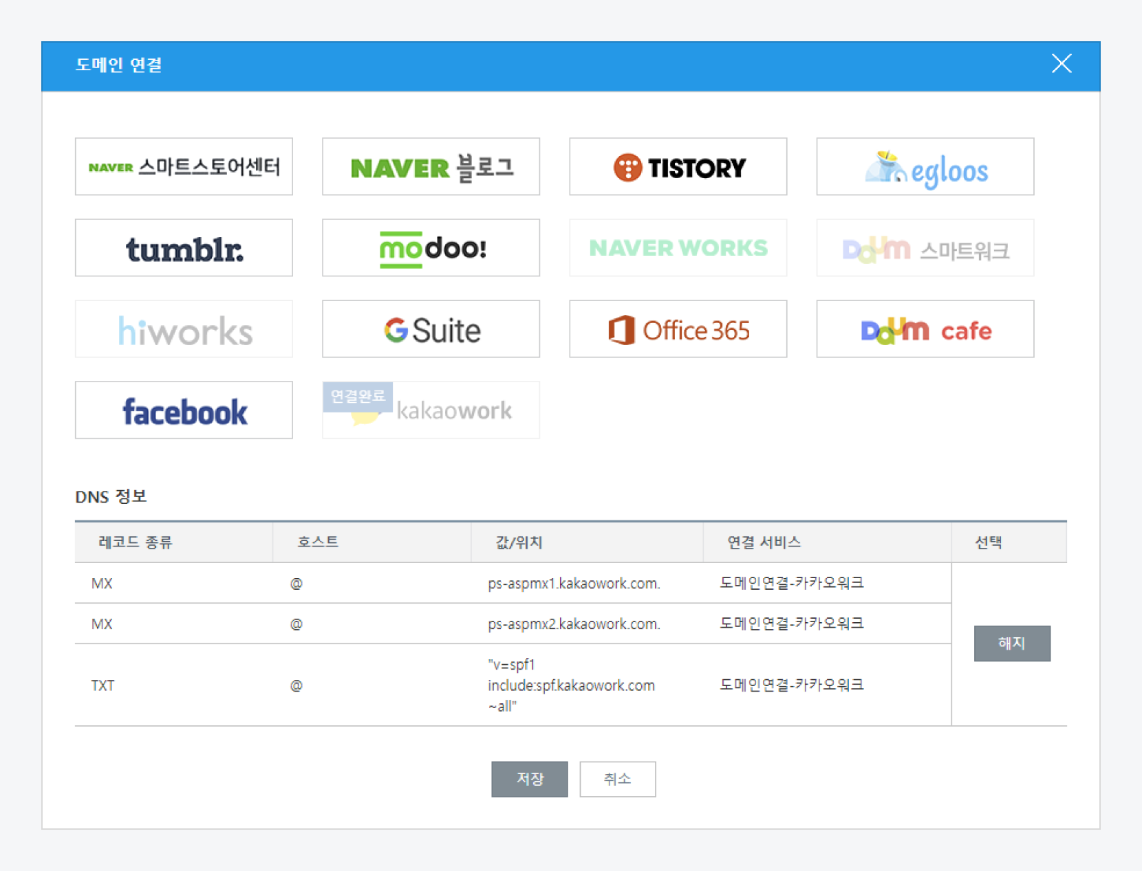 신규로 구입했거나, 기존에 사용하던 도메인을 카카오워크 메일 서비스와 연동하기 위해서는 [MX/SPF 레코드 연동](#record), [메일 도메인 추가](#add), [계정 연동](#account) 작업을 차례로 수행해야 합니다.