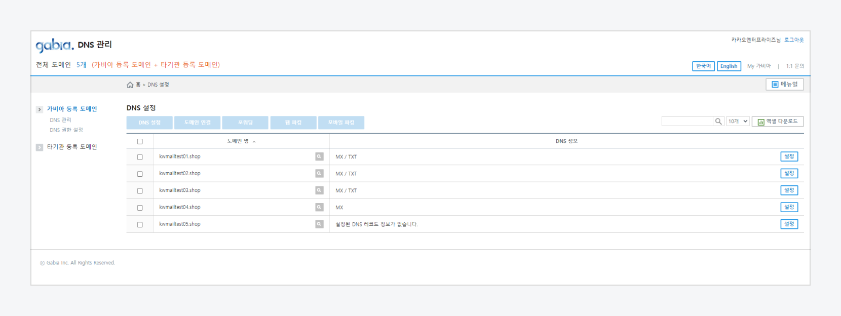 * 본 가이드에서는 가비아 등록 사이트를 예시로 설명합니다. 다른 사이트에 도메인이 등록된 경우, 해당 사이트의 DNS 관리 메뉴에서 카카오워크 메일의 MX/SPF 레코드를 입력해야 합니다.