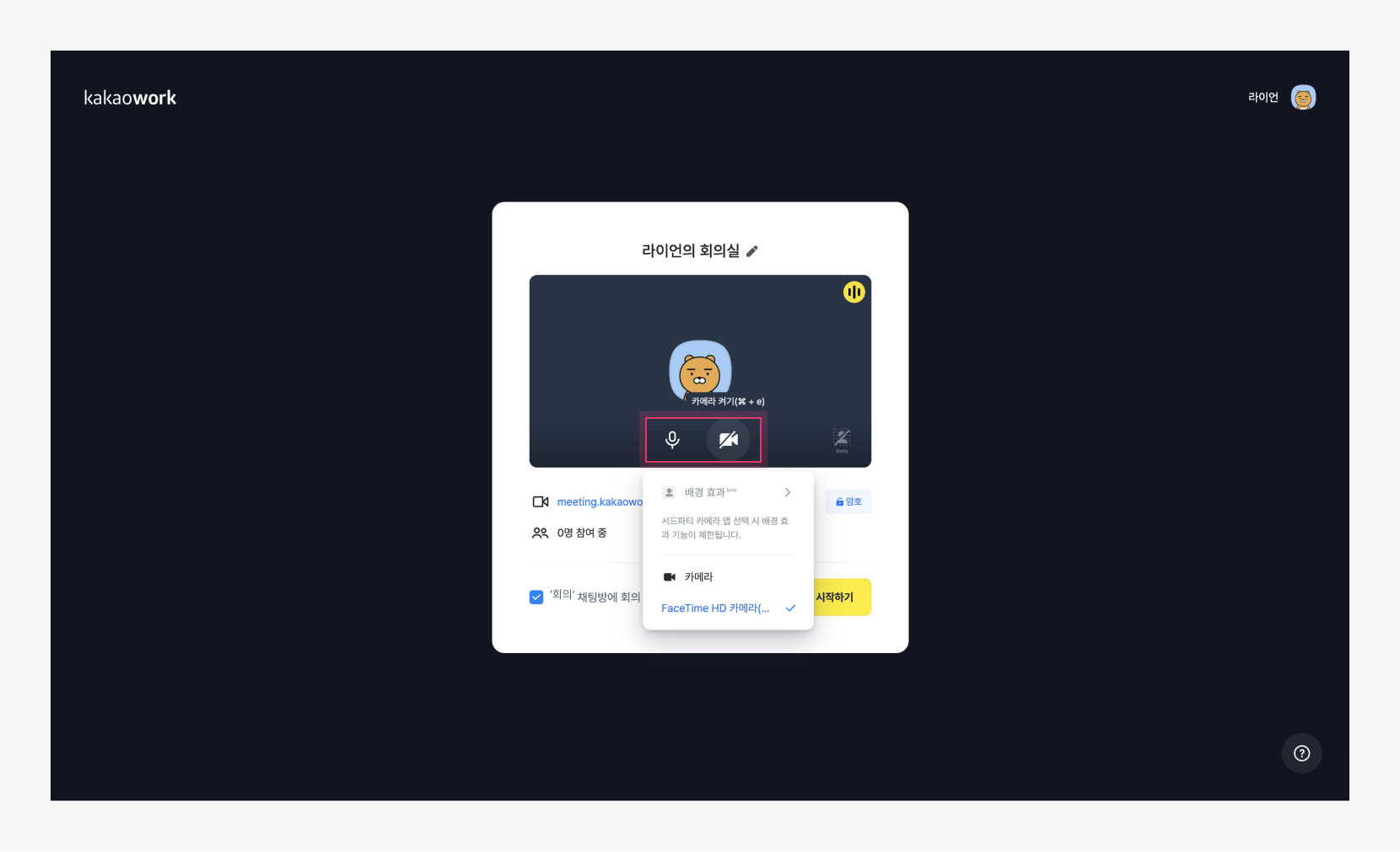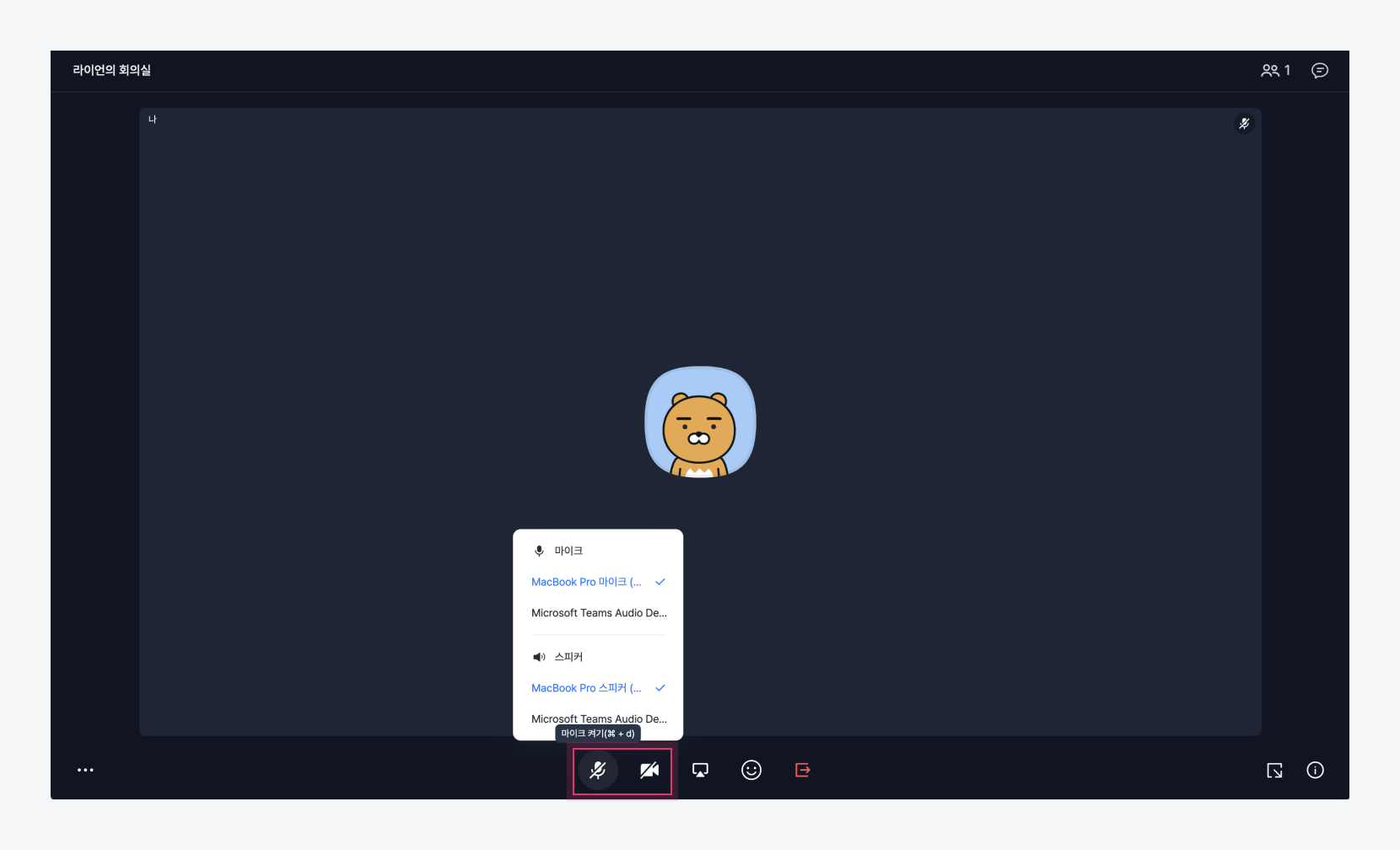 대기실에서 카메라와 마이크 On/Off [마이크] 혹은 [카메라] 아이콘에 마우스 오버하여 마우스, 스피커, 카메라를 다른 기기로 변경할 수 있습니다.