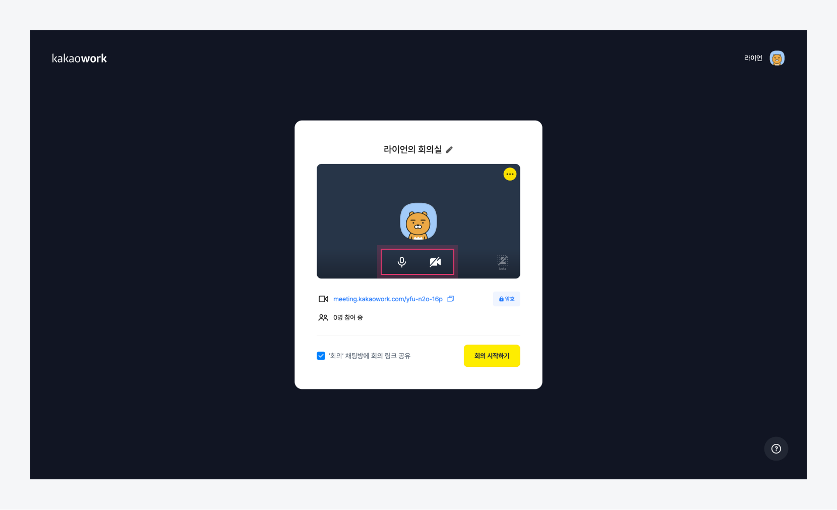 화상회의 대기실 화면에서 [마이크]와 [카메라] 아이콘을 클릭하여 On/Off 설정합니다.