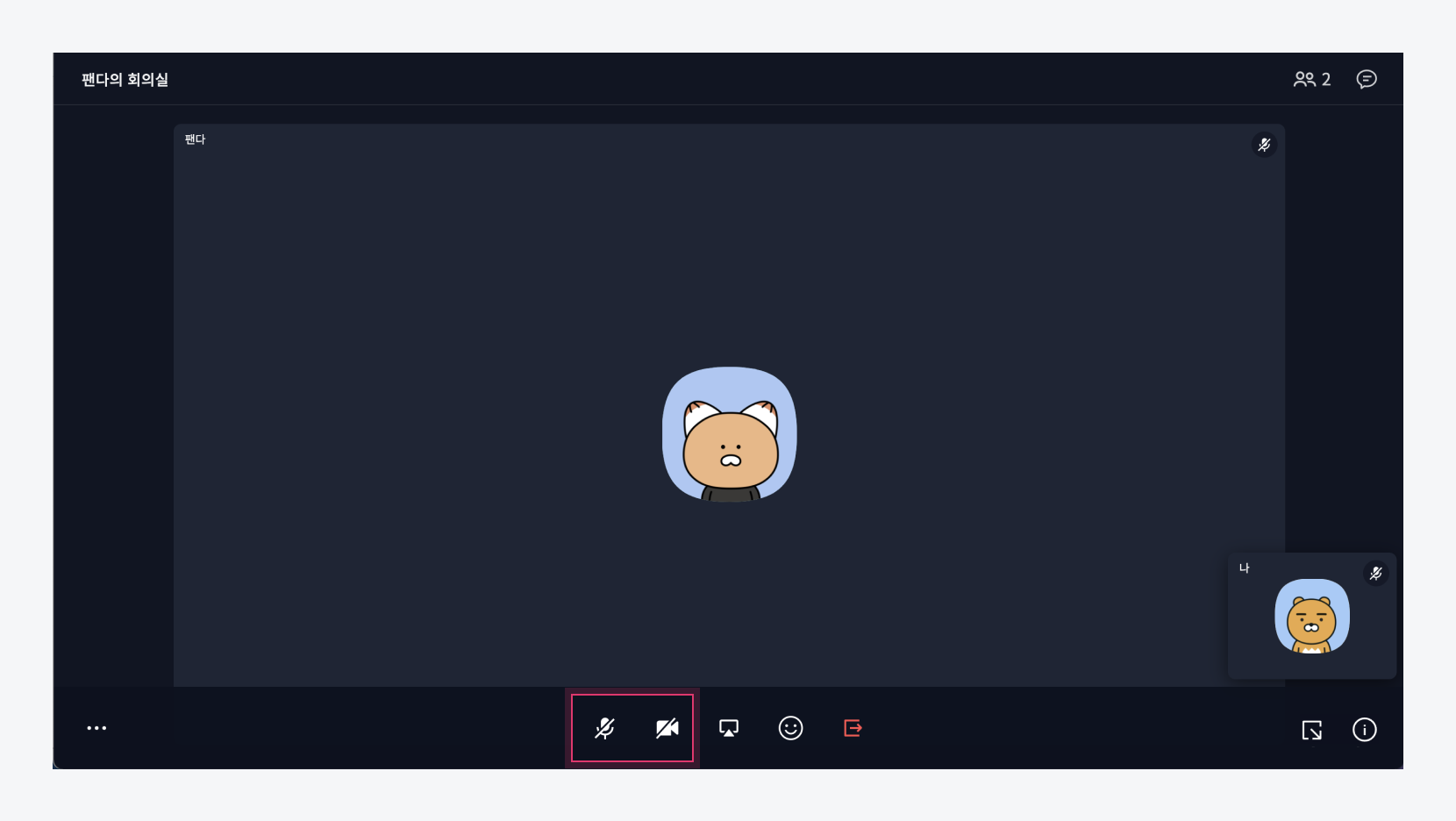 화상회의 화면에서 [마이크]와 [카메라] 아이콘을 클릭하여 On/Off 설정합니다.