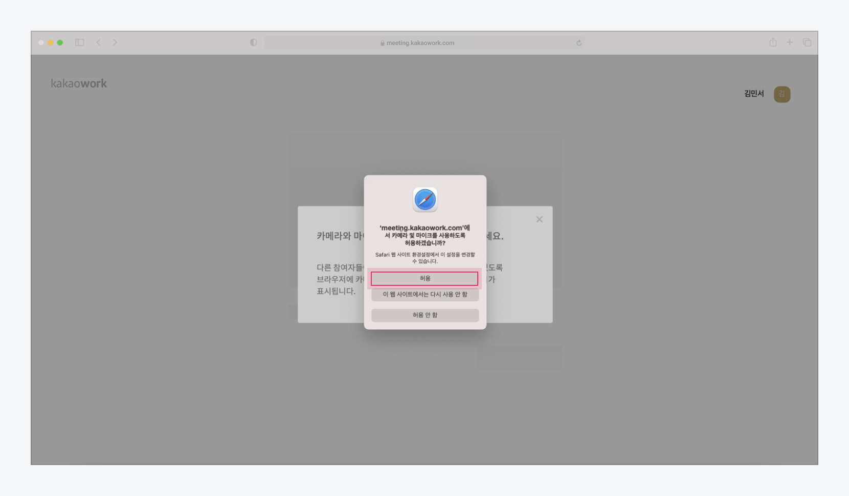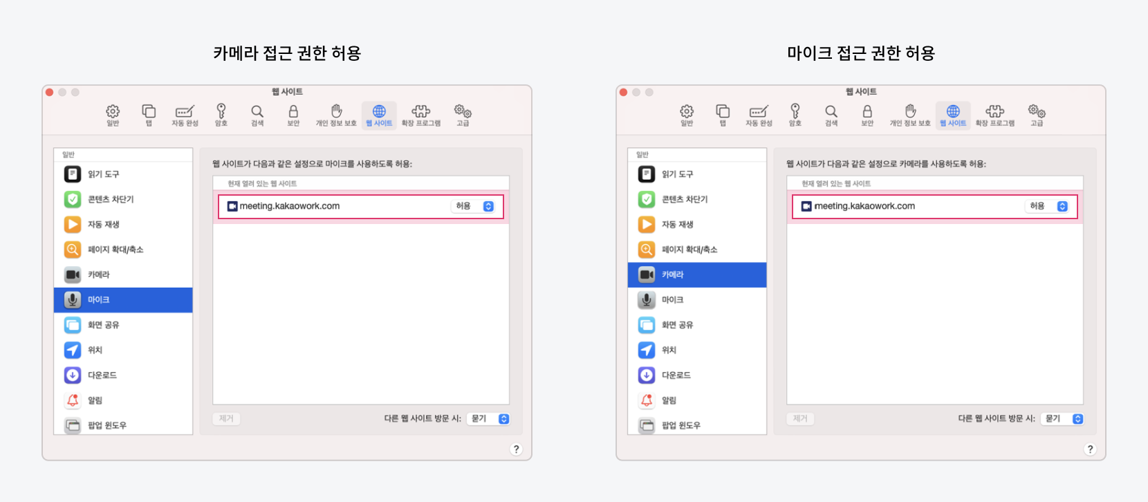 Safari 화면 공유 권한 묻기 b. 카메라와 마이크 항목에서 meeting.kakaowork.com 접근 권한을 각각 허용으로 변경합니다.