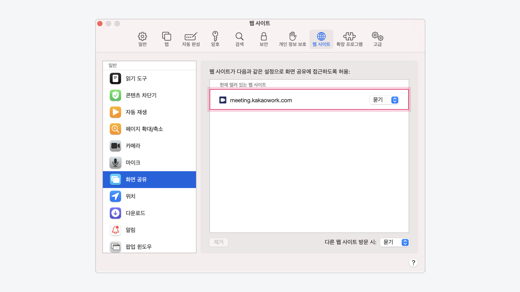 a. 화면 공유 항목의 meeting.kakaowork.com 접근 권한을 묻기로 변경합니다.