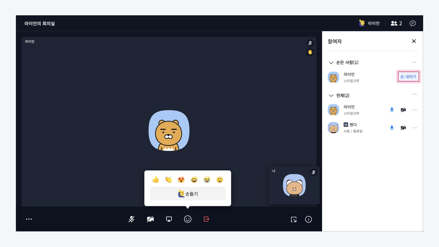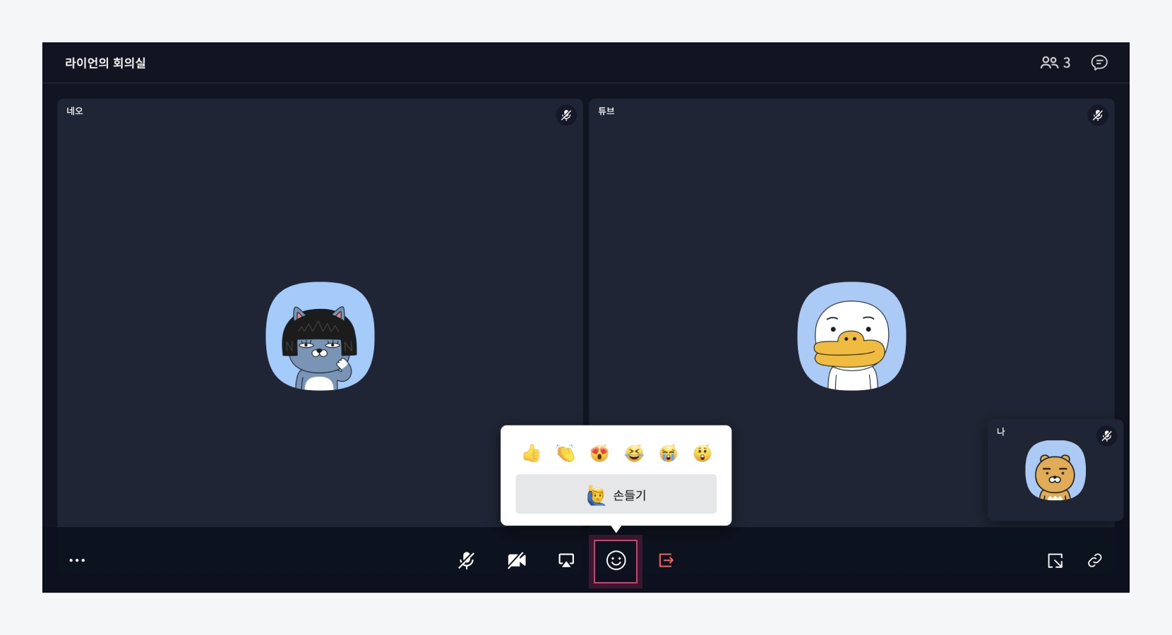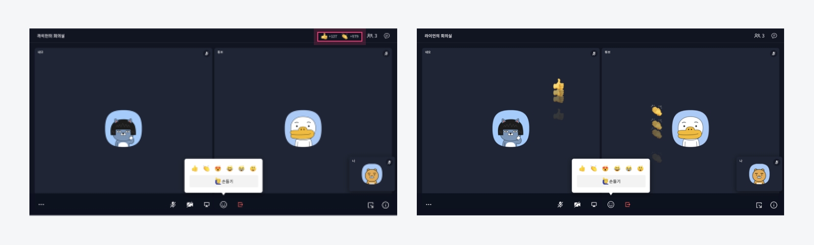 이모지 선택 참여자들이 이모지 반응을 하면 실시간으로 화면에 이모지가 나타납니다.
