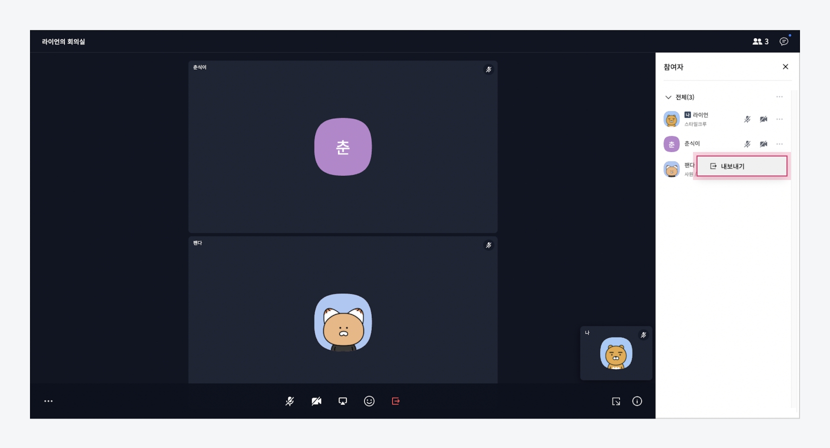 참여자 목록에서 [···] 아이콘을 클릭하고 [내보내기] 버튼을 클릭합니다.
