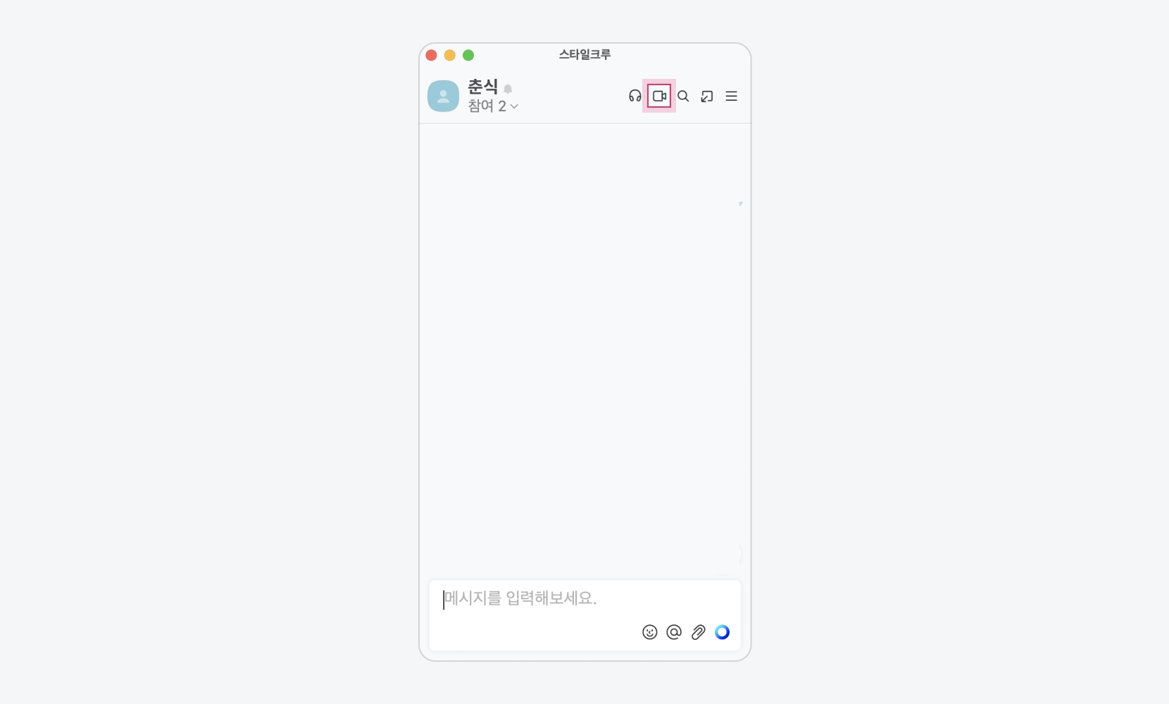 화상회의를 시작할 채팅방에 진입한 뒤, 채팅방 상단의 [카메라] 아이콘을 클릭하여 화상회의를 시작합니다.