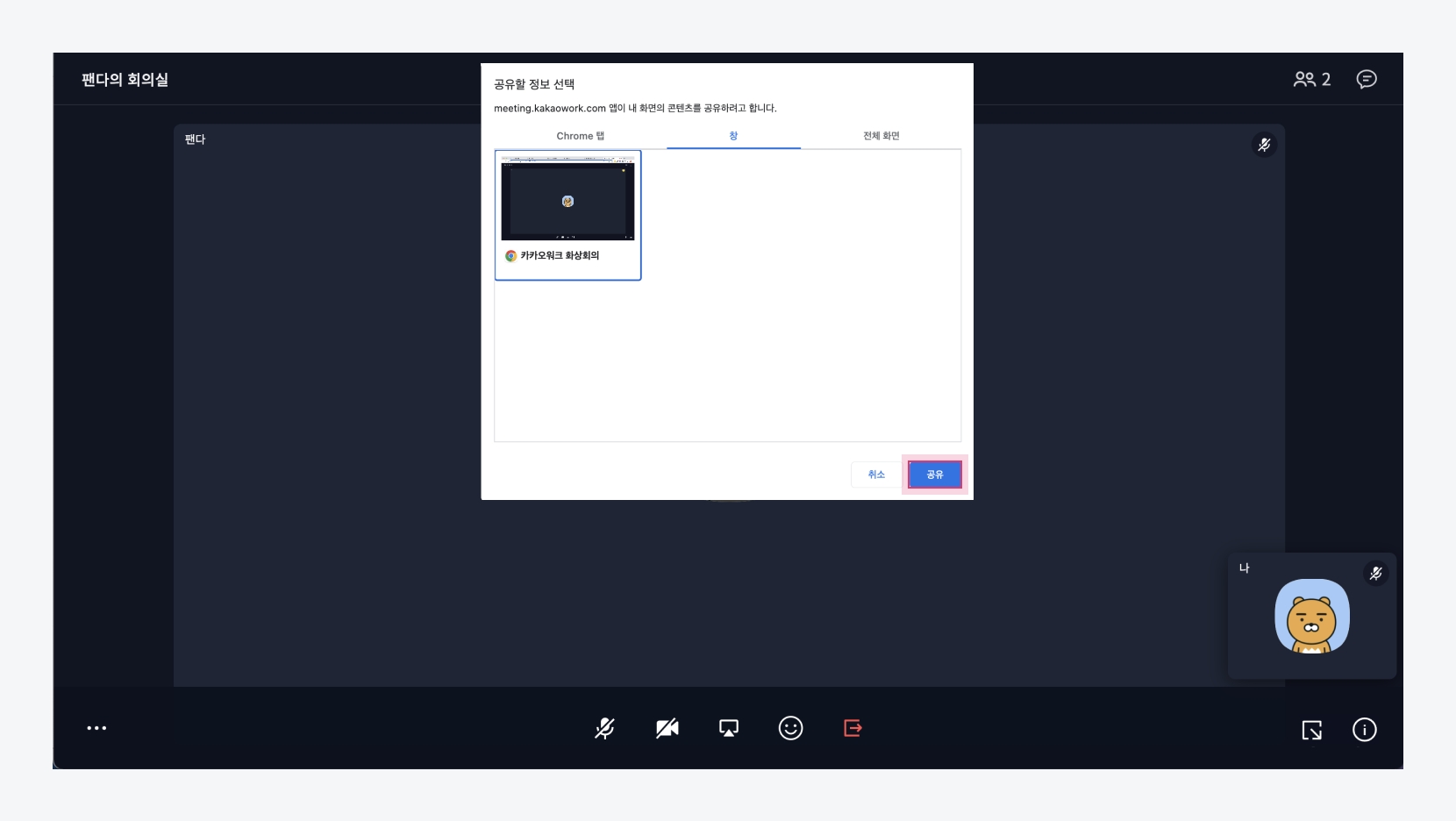 화면 공유 공유할 화면을 선택하고 [공유] 버튼을 클릭합니다.
