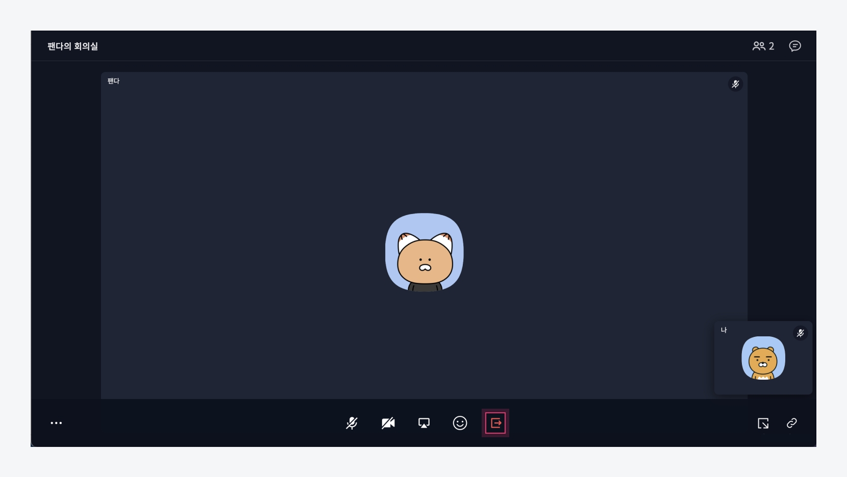 주요 기능 아이콘 모음 - 마이크: On/Off 및 기기 변경 - 카메라: On/Off 및 기기 변경 - 화면 공유: 클릭 시 PC 화면을 참여자들에게 공유 - 리액션: 이모지와 손들기 기능 - 나가기: 화상회의에서 나가기