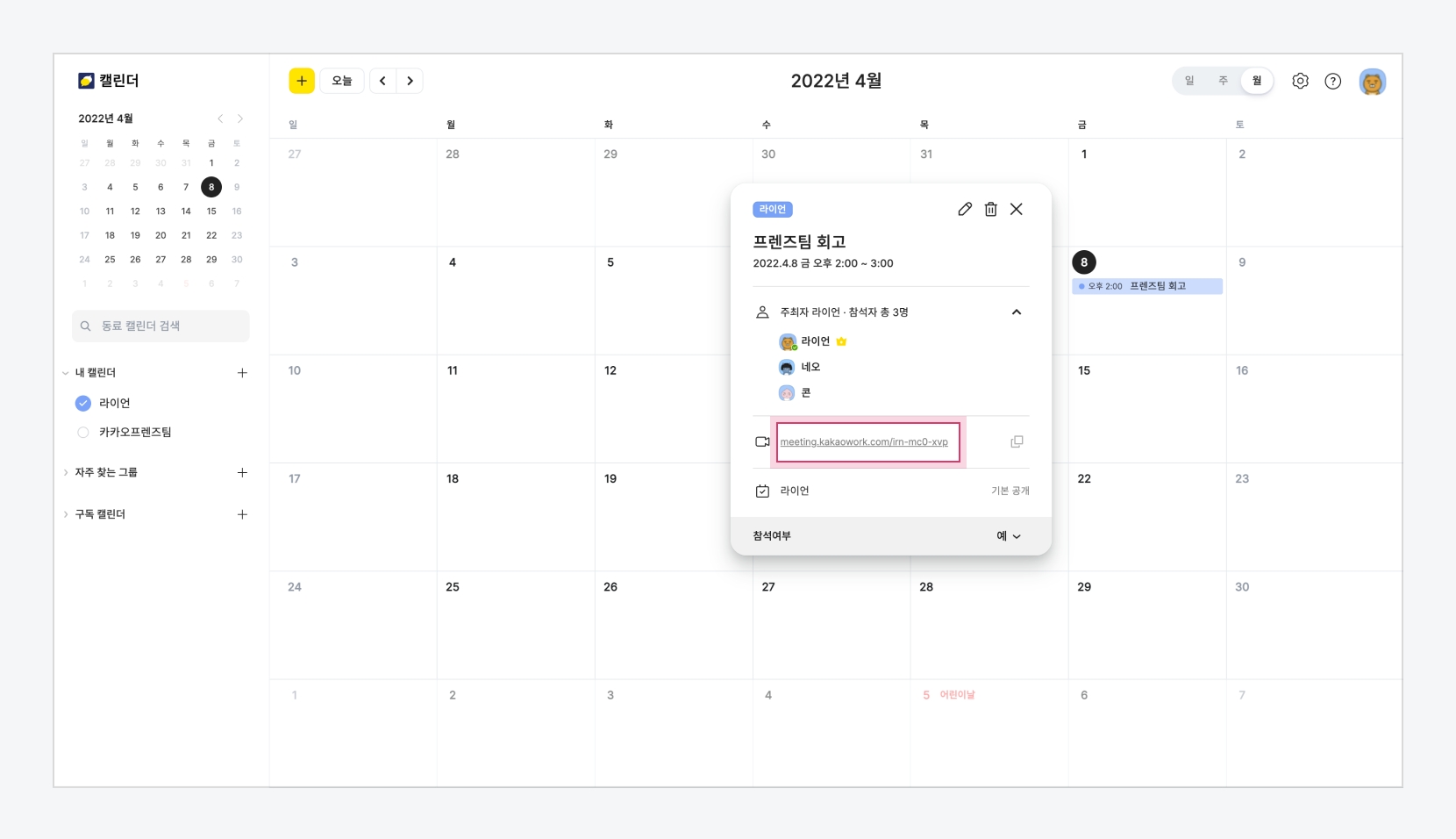 캘린더에서 일정을 생성할 때 자동 생성되는 화상회의 링크를 활용하여 화상회의를 시작할 수 있습니다. 새로운 일정이 생성되면, 참여자들에게 화상회의 링크가 포함된 일정 초대 이메일과 카카오워크 알림이 발송됩니다. 참여자들은 캘린더 일정, 이메일 알림, 카카오워크 알림 메시지에서 화상회의 링크를 클릭하여 회의에 참여할 수 있습니다.