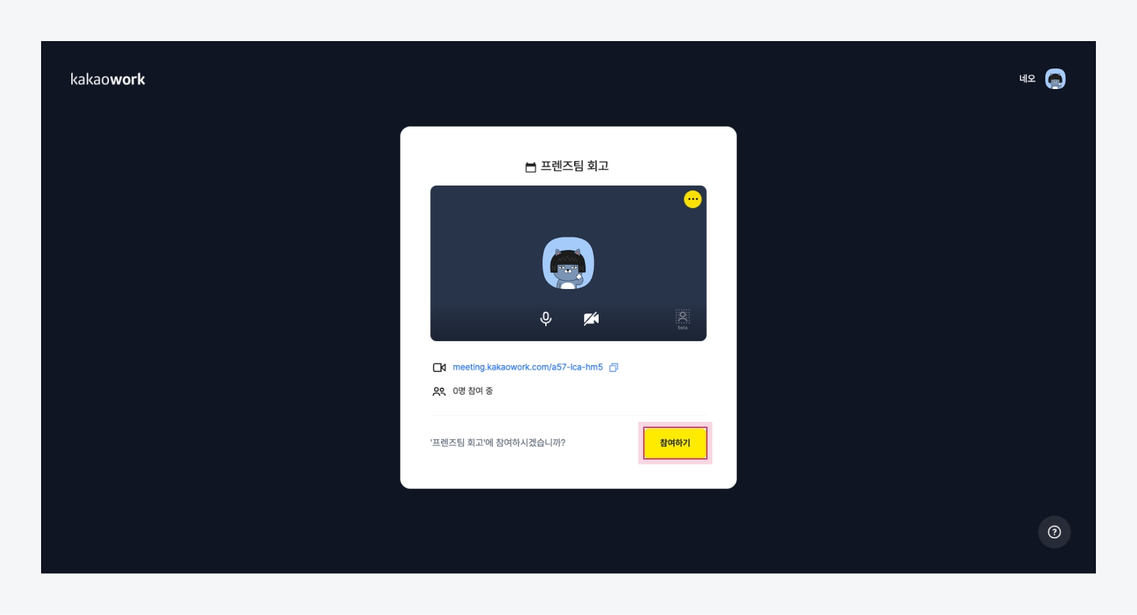 화상회의 링크 클릭 [참여하기] 버튼을 클릭하여 화상회의에 참여합니다.