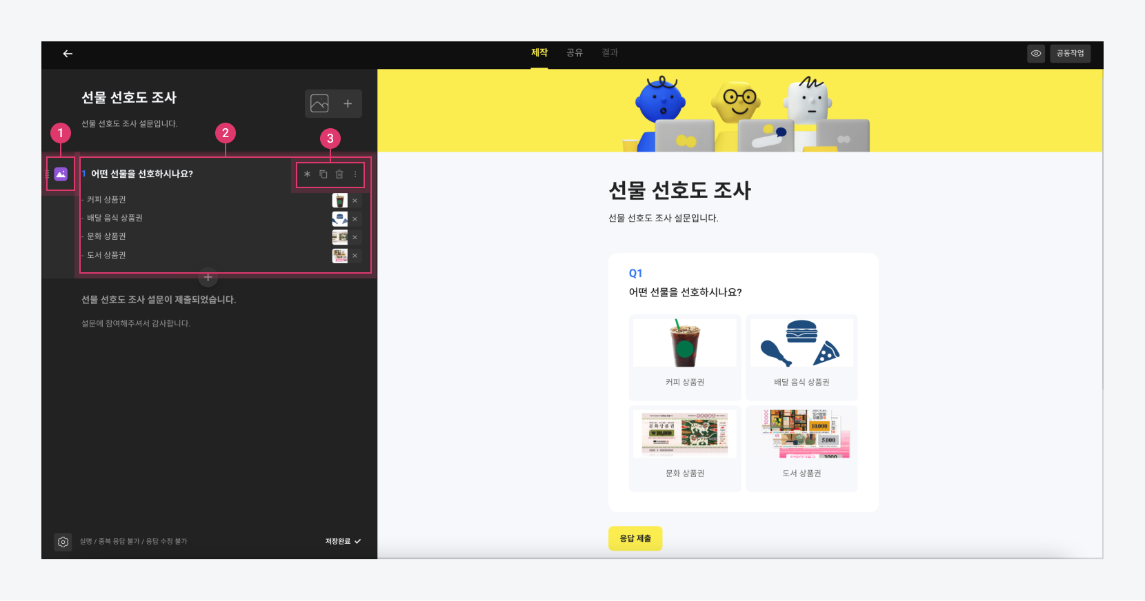 응답 옵션을 작성하고, 응답 옵션별로 이미지를 추가 가능
