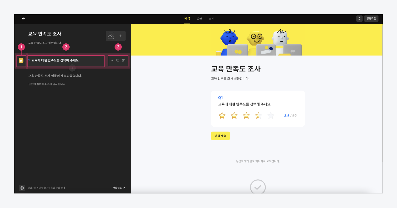 별점 질문 유형은 5점 만점을 기준으로 0.5점 단위로 값을 선택하도록 하는 질문 유형으로, 특정 항목의 호감도를 조사할 때 유용합니다.