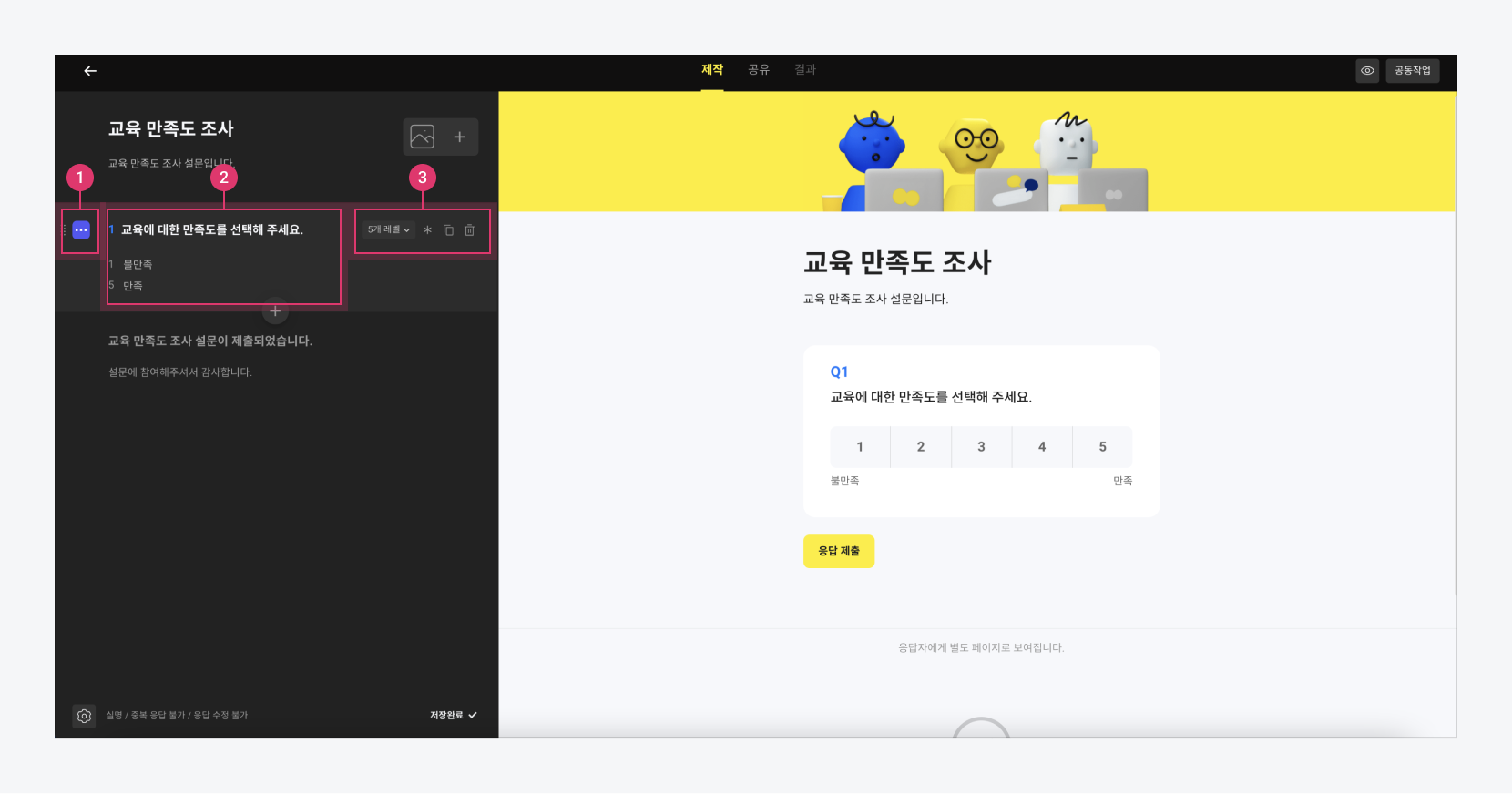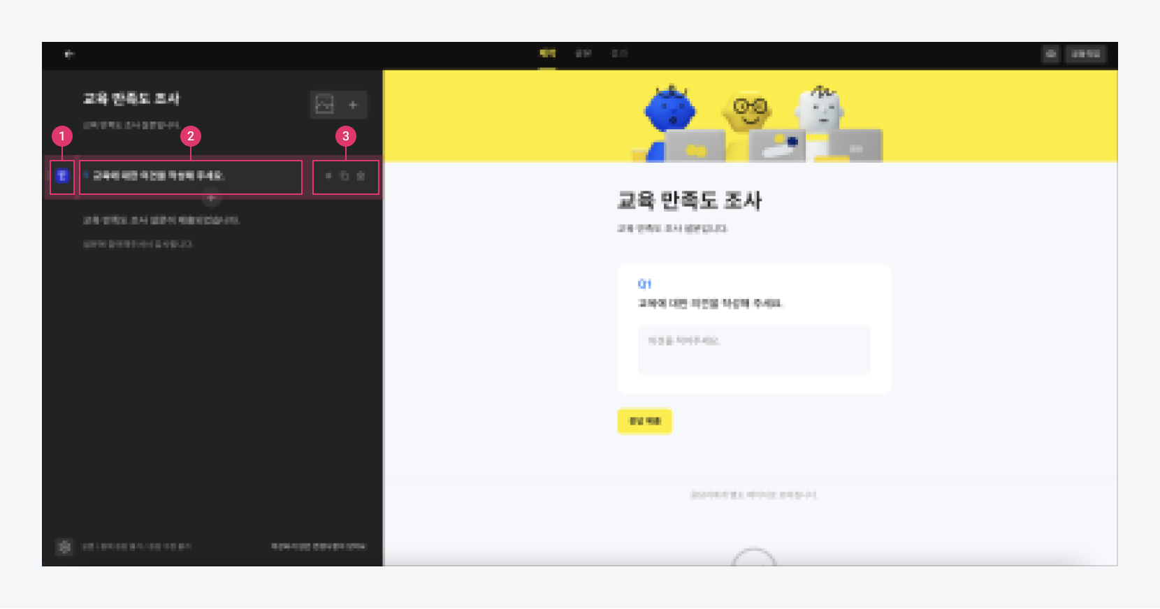 디음 설정을 적용 가능 - '기타' 항목 추가: 활성화 시 기타 항목을 추가하여 주관식 응답을 허용 - 복수 선택 허용: 활성화 시 복수 선택을 허용