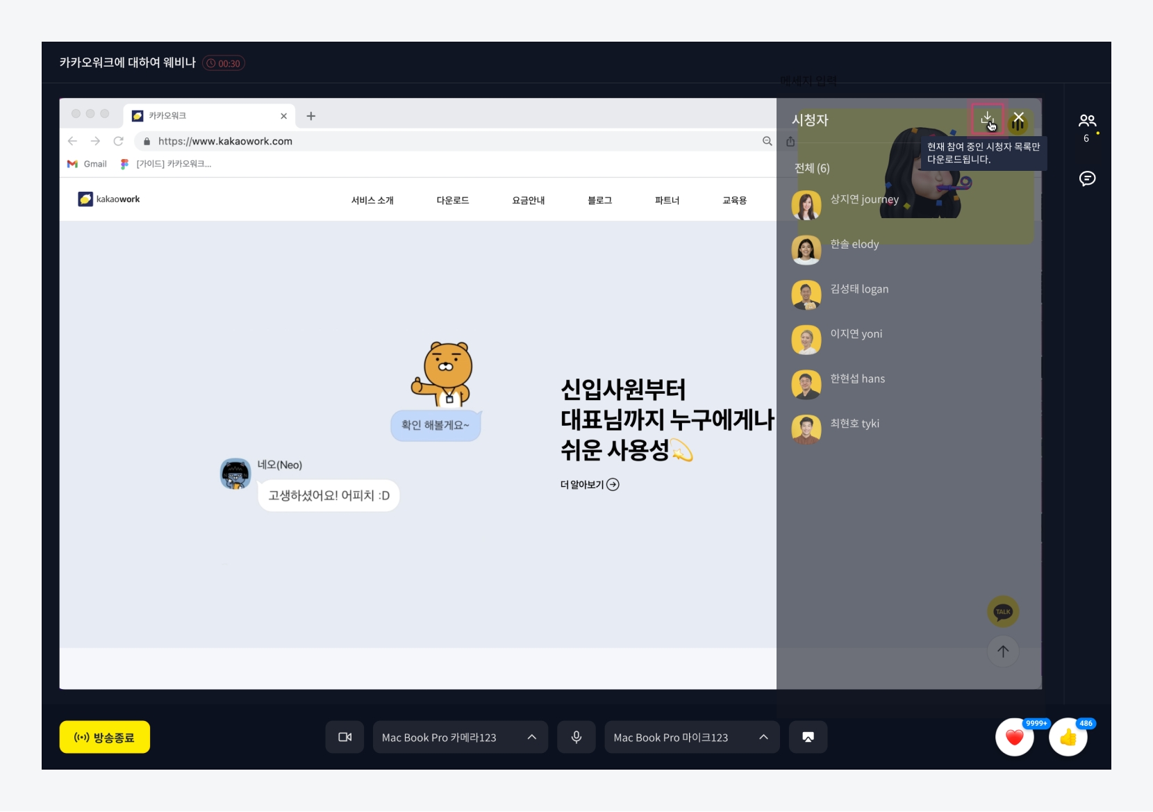 현재 방송에 참여 중인 시청자 목록 표시 - 웨비나 주최자는 시청자 목록 다운로드 가능
