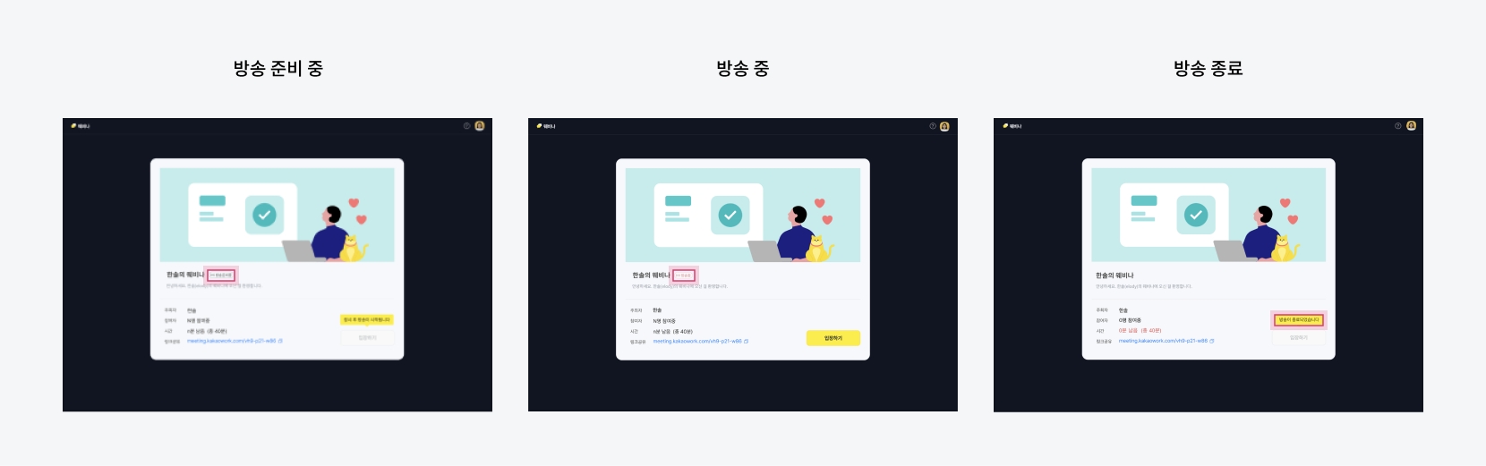 웨비나 상태(방송 준비 중/방송 중/방송 종료) 구분설명방송 준비 중