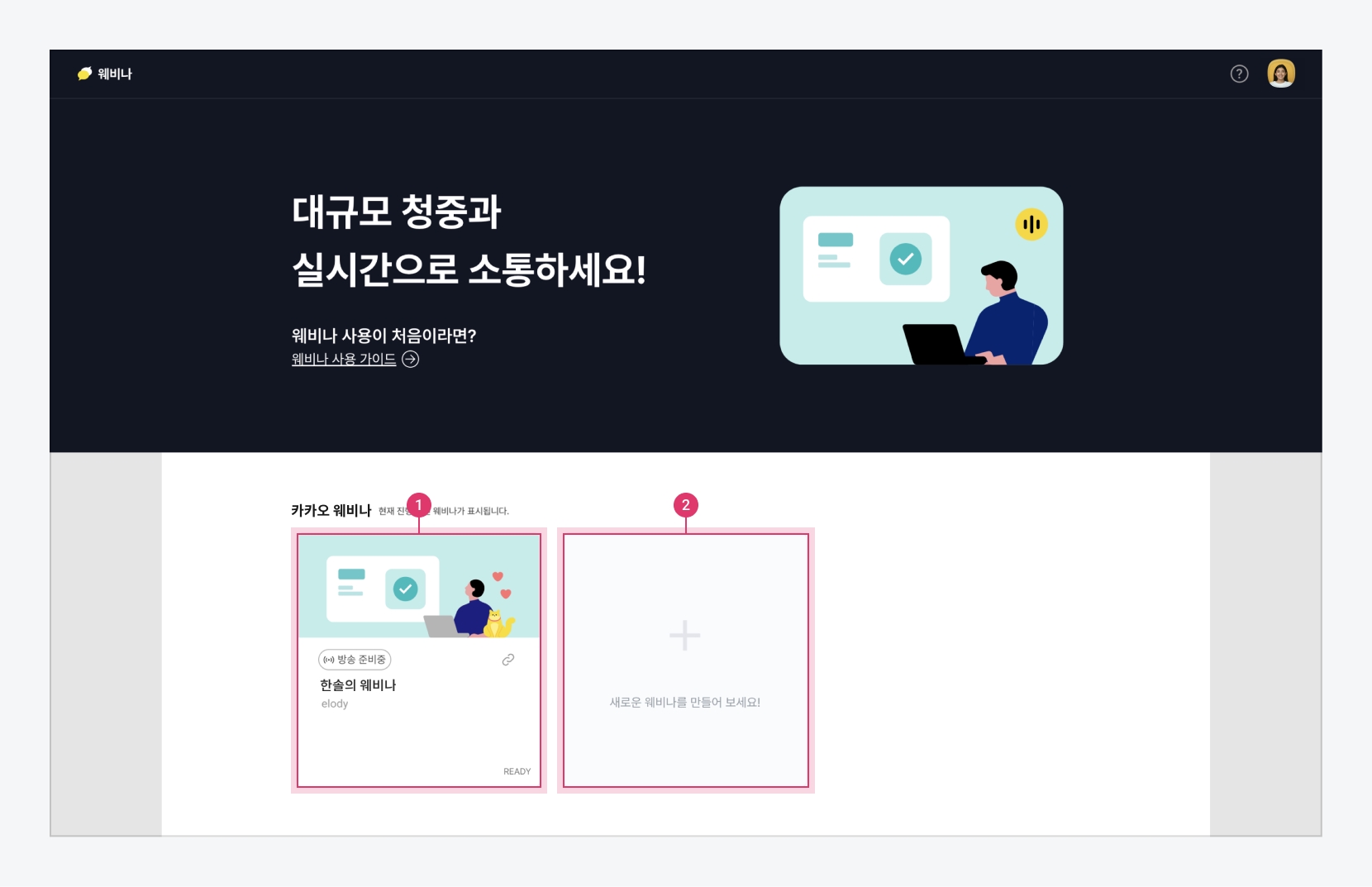 웨비나 서비스의 홈 화면과 방송 화면 구성은 다음과 같습니다.