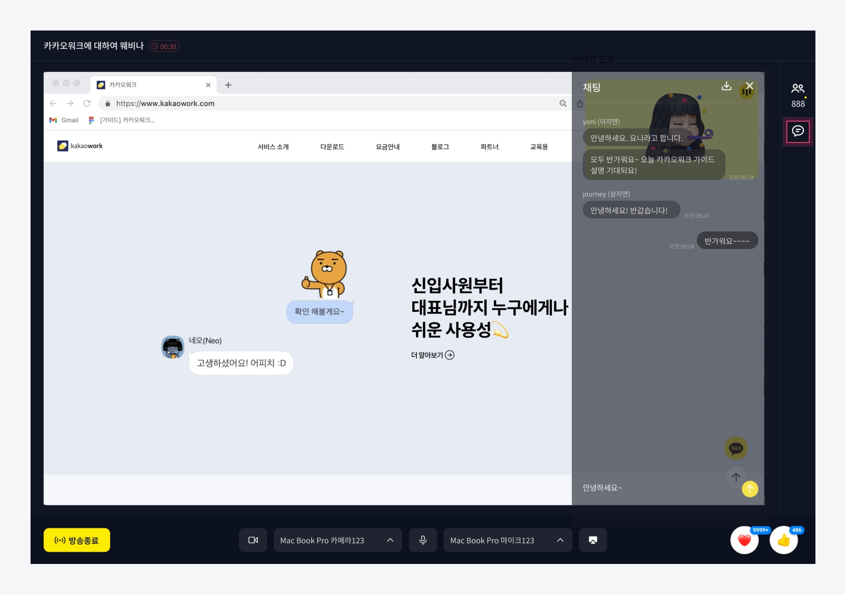 웨비나에 참여하여 채팅, 리액션으로 소통할 수 있으며, 현재 웨비나에 참여한 시청자 목록을 확인할 수 있습니다.