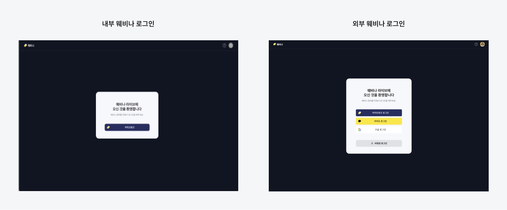 카카오워크 내부/외부 웨비나 로그인 방식 구분내부 웨비나외부 웨비나공개 여부